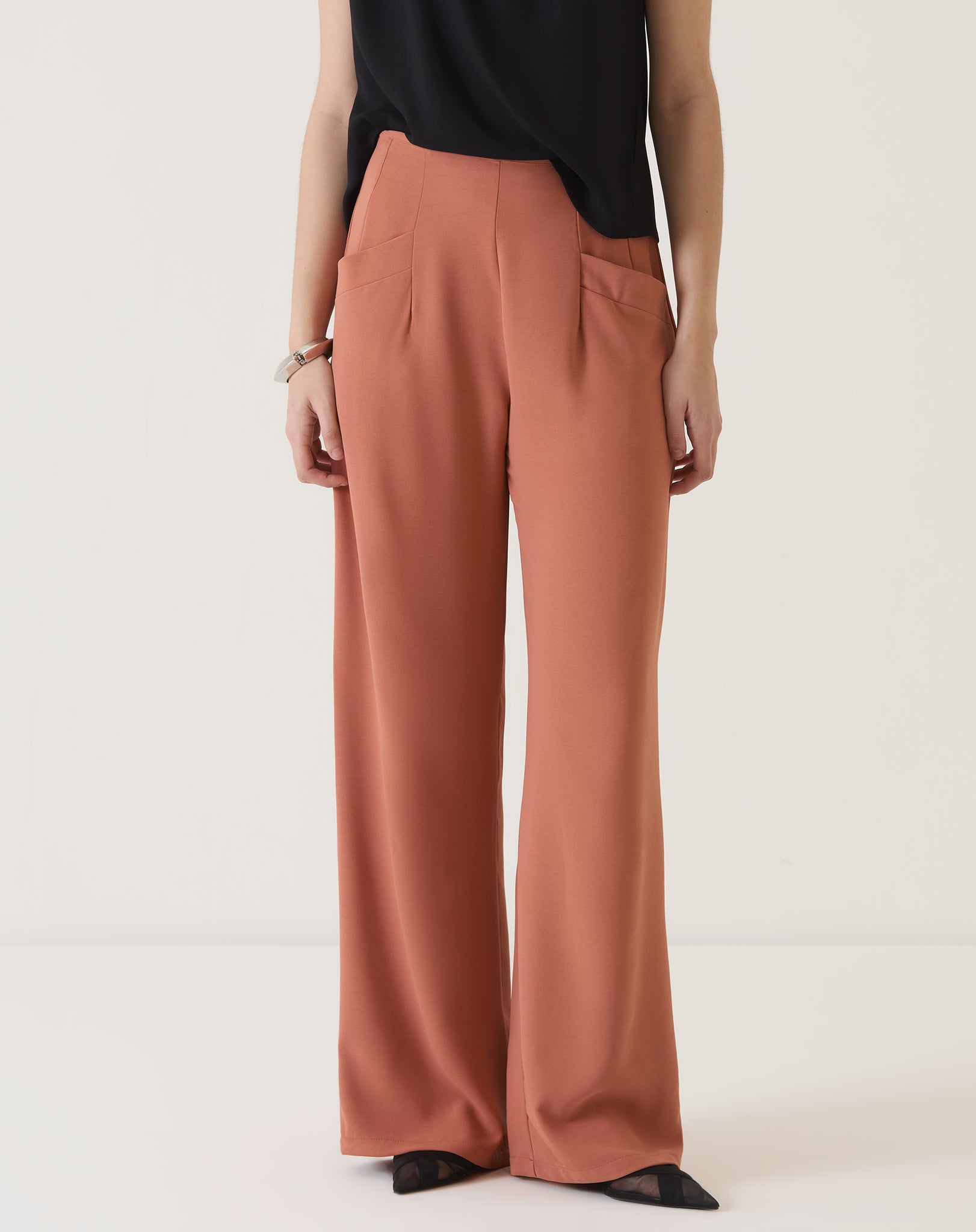 Close-up do cós e bolsos da calça de alfaiataria terracota.