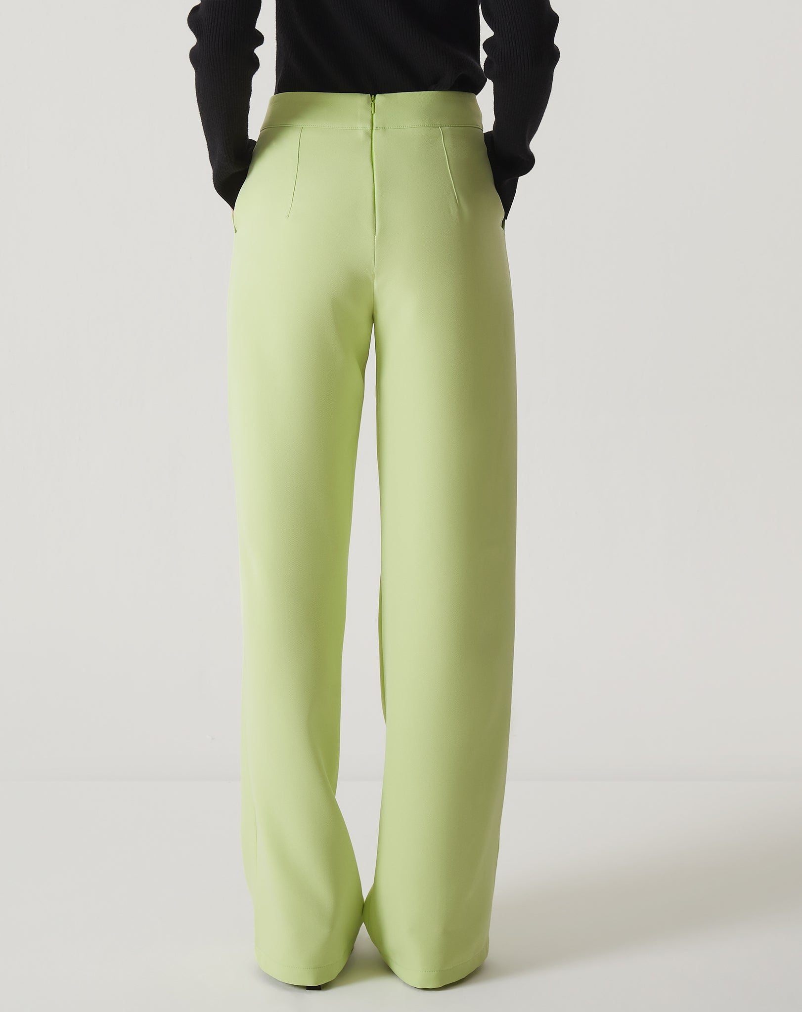 Detalhe do fechamento traseiro da calça reta de alfaiataria verde claro.