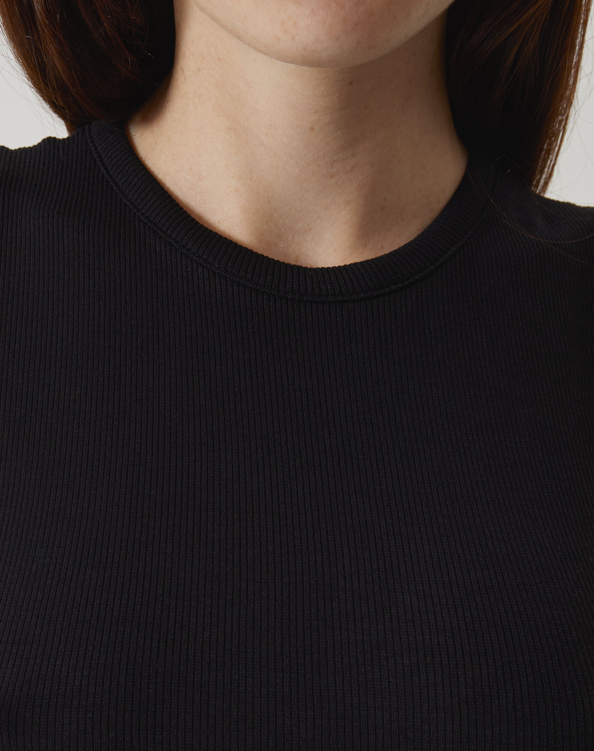 Detalhe do decote gola da regata curta de malha preta, mostrando o tecido e o acabamento.