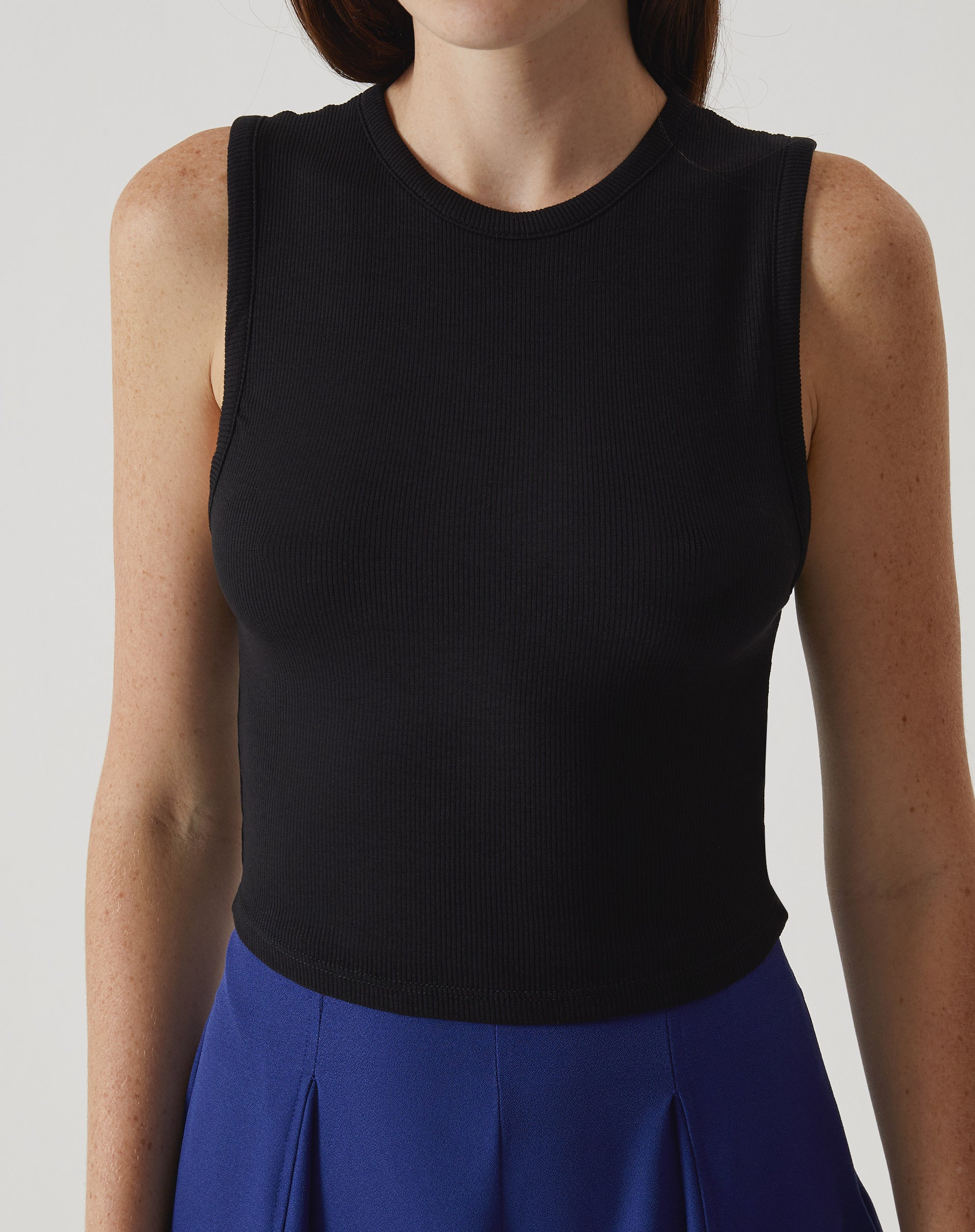 Regata curta de malha preta vista de frente, destacando o design sem alças e o decote gola.