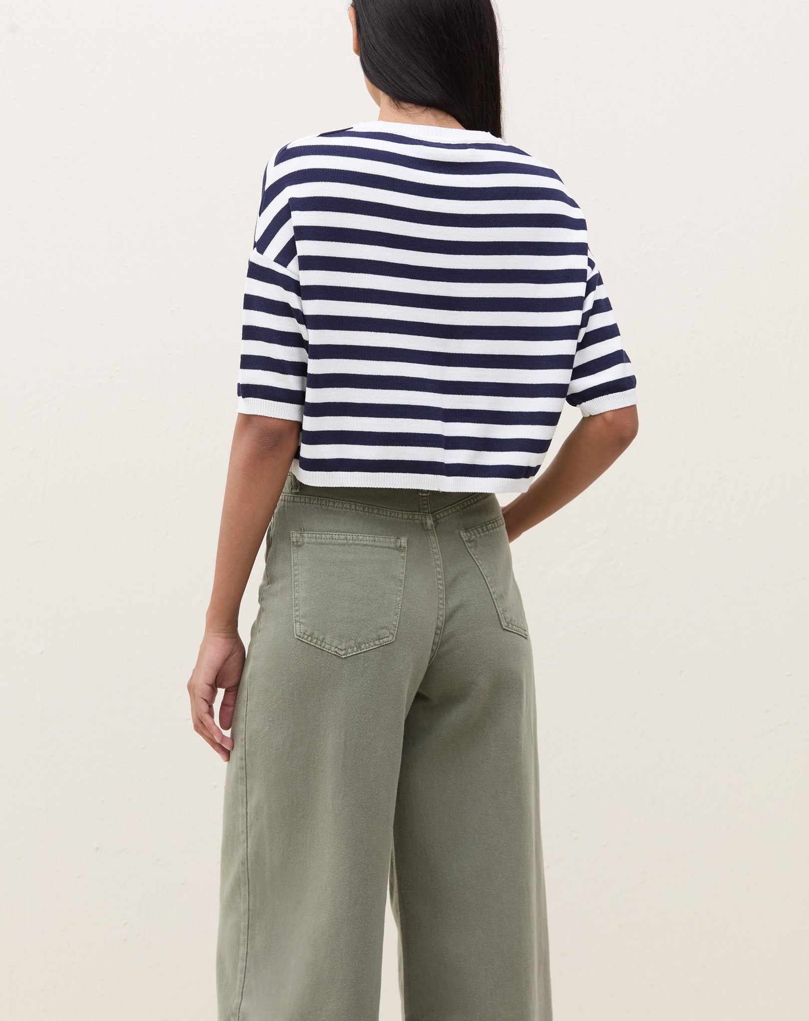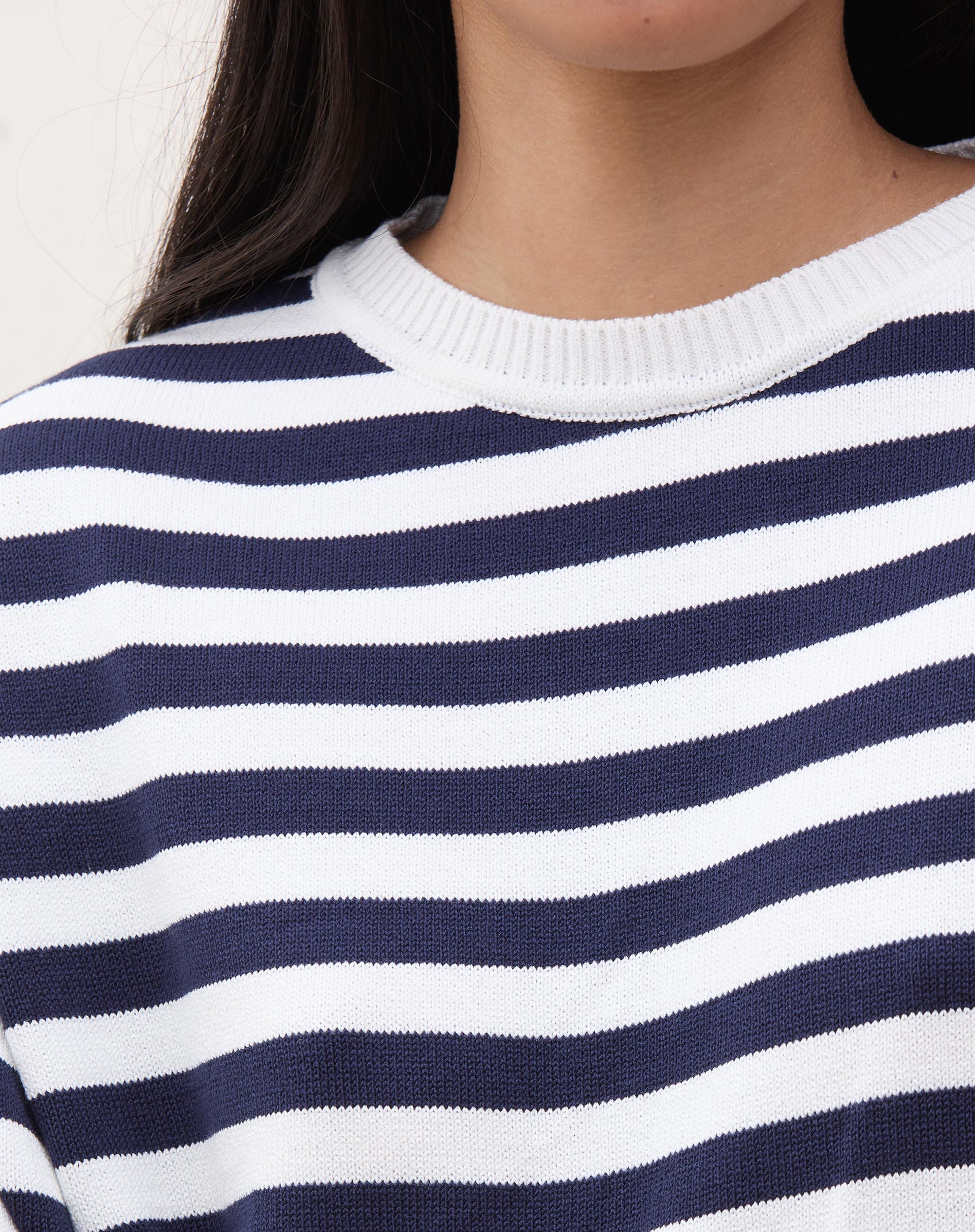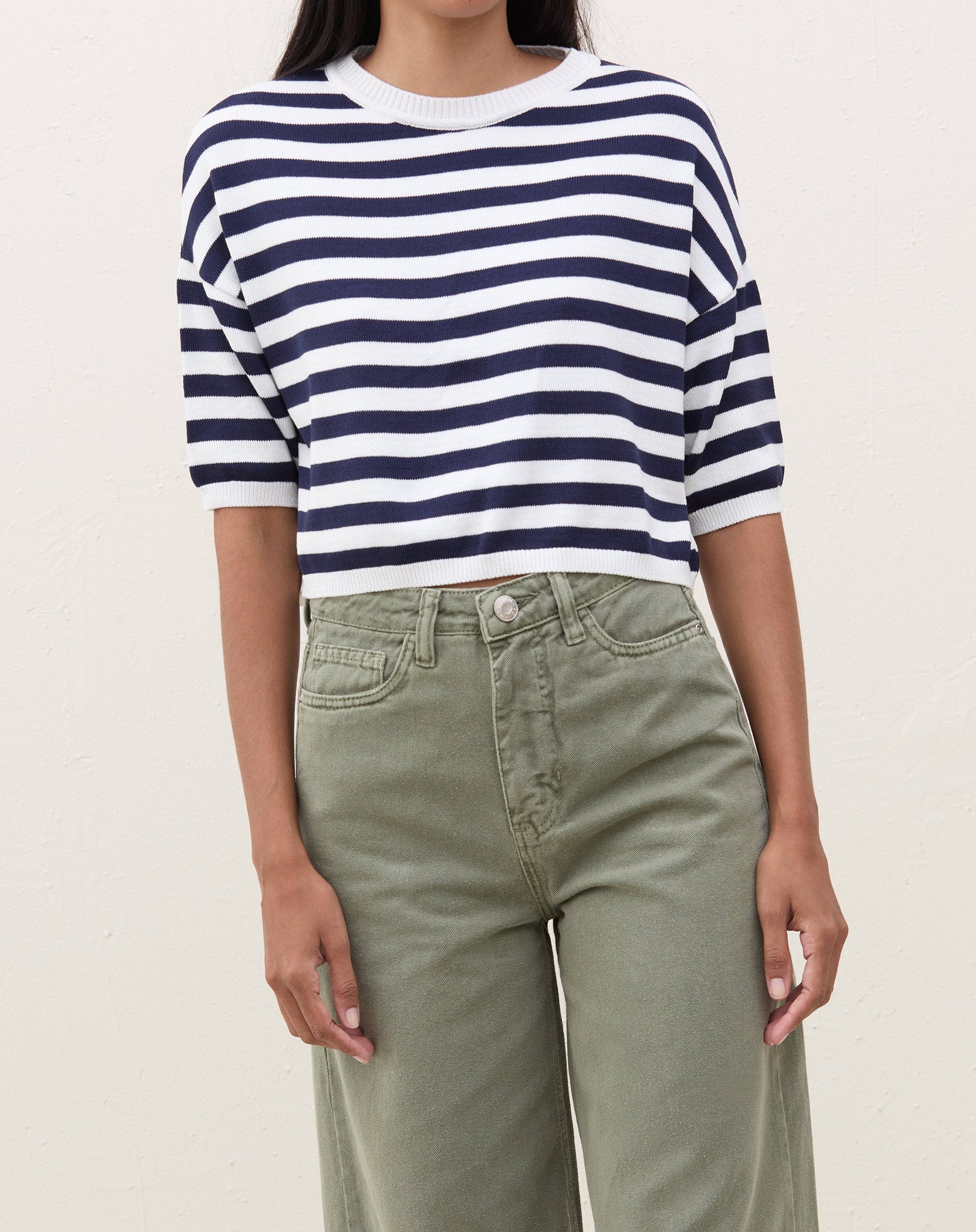 Camiseta Cropped de Tricot Listrada - Azul Marinho e Branco