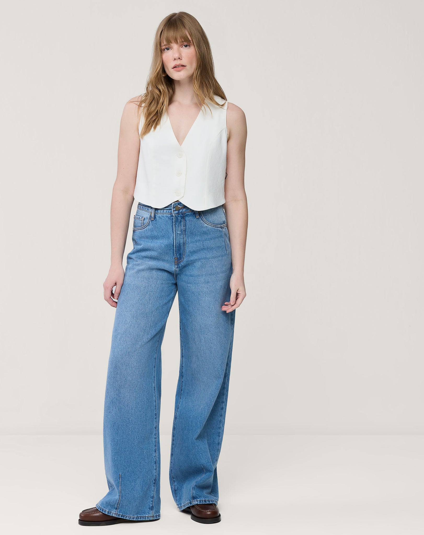 Look completo com colete branco cropped e calça jeans wide leg azul, styling casual contemporâneo