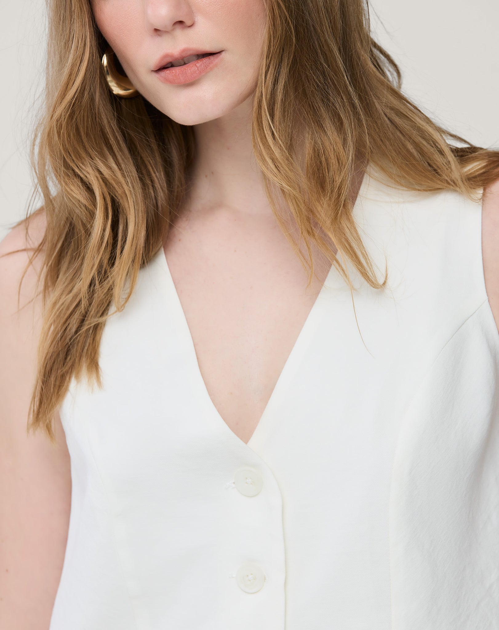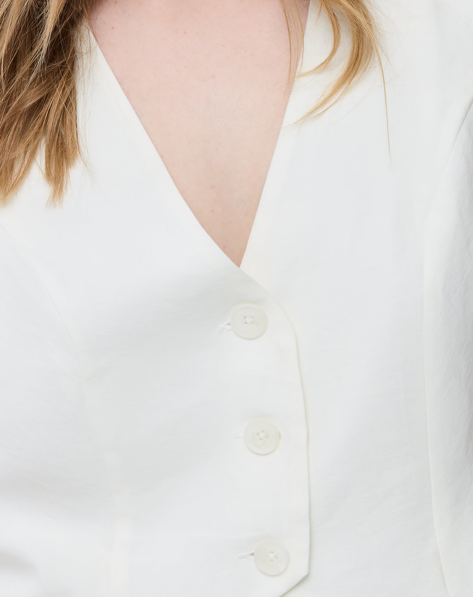 Colete cropped branco com decote em V e botões frontais, vista frontal aplicativo de moda - colete branco minimalista