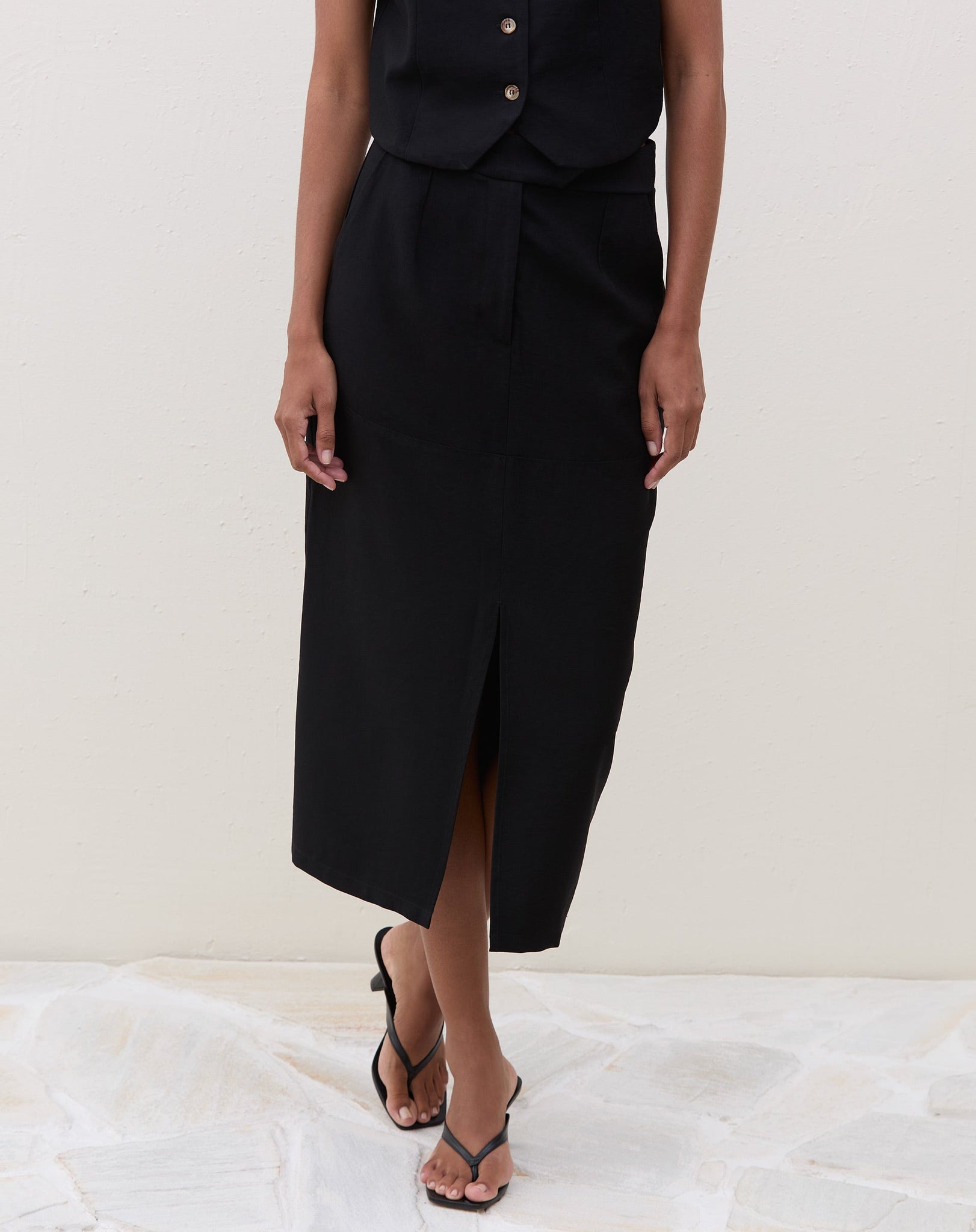 Modelo vestindo saia midi preta com fenda frontal e colete preto, em pose frontal.