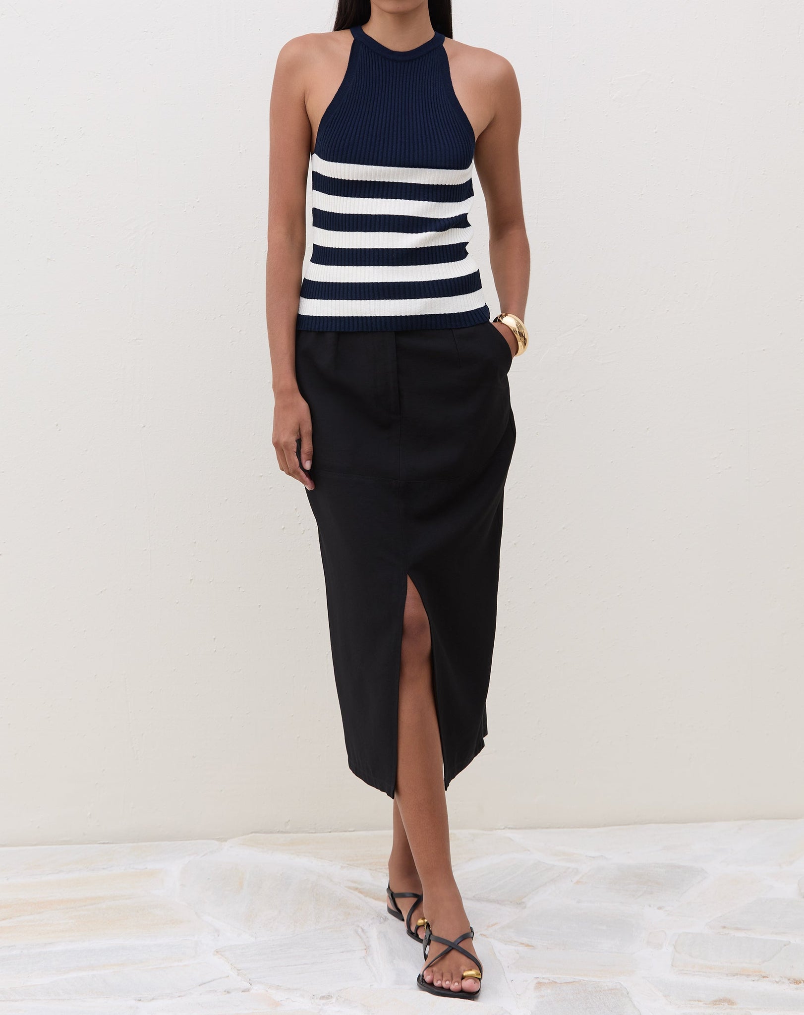 Modelo vestindo saia midi preta com fenda frontal e blusa listrada, em pose frontal.