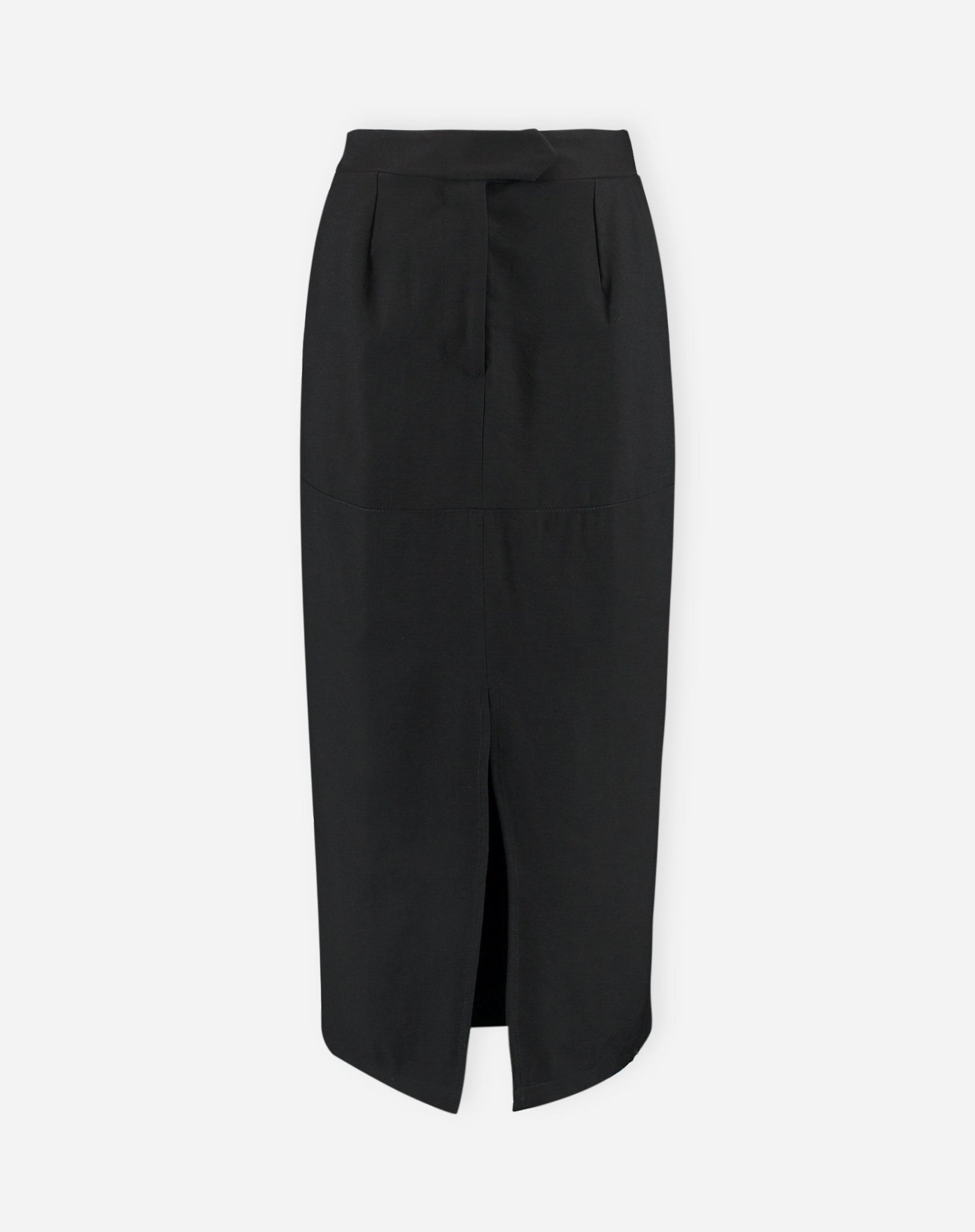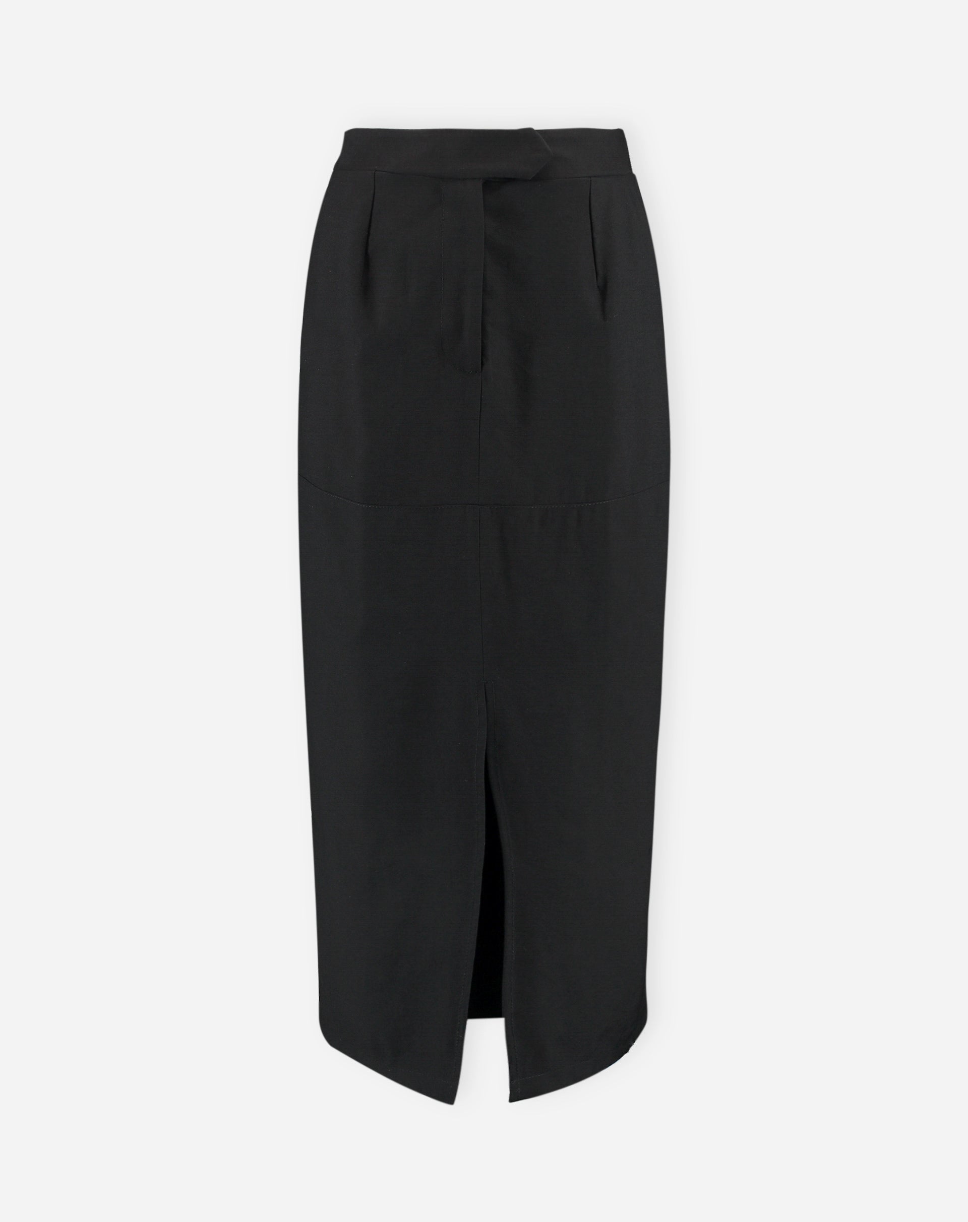 Imagem da saia midi preta com fenda frontal, em fundo branco.