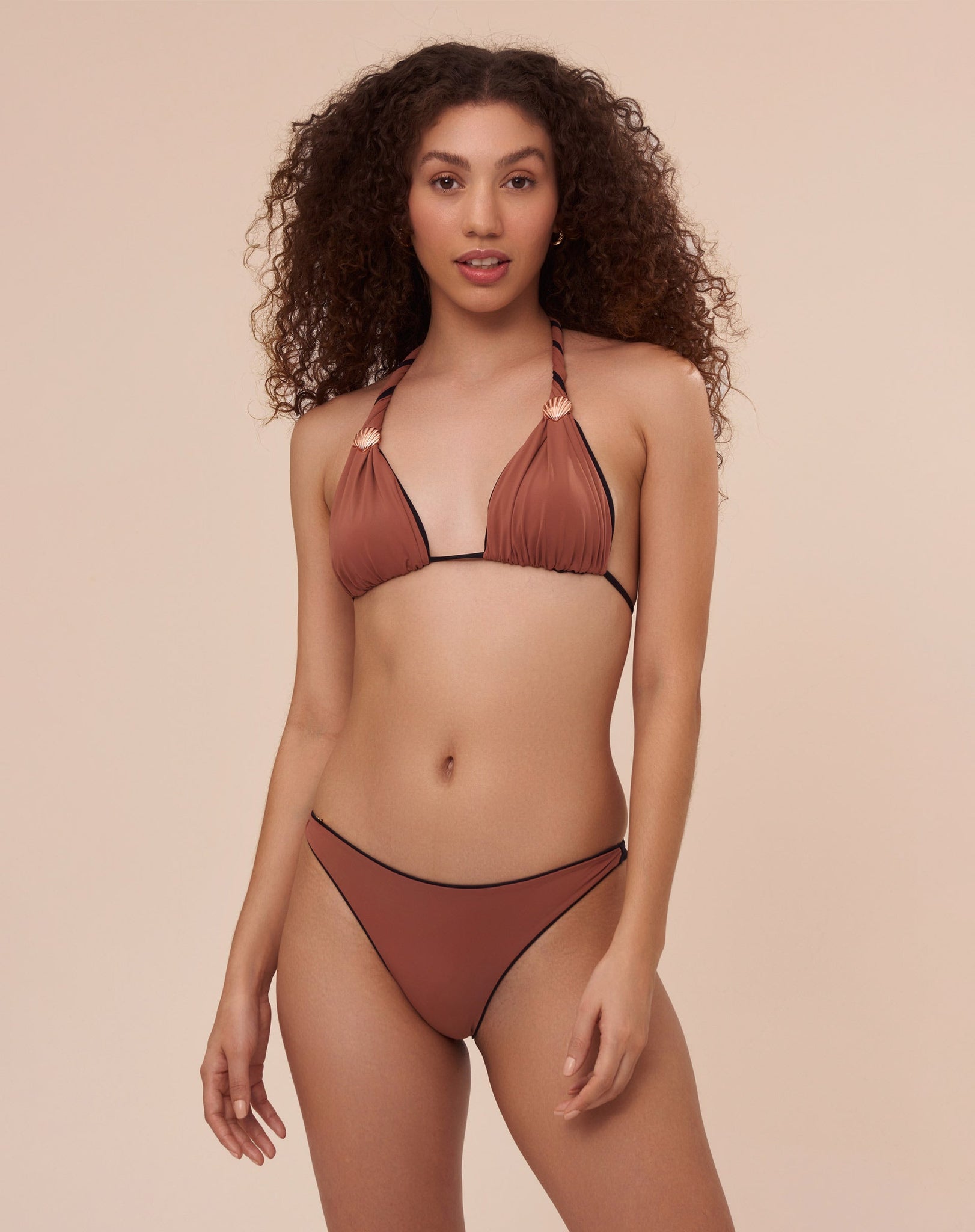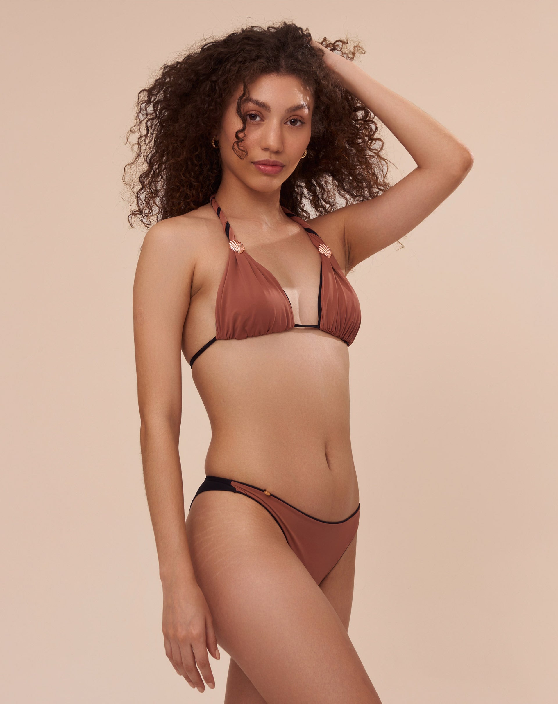 Top confeccionado em tecido biodegradável com toque gelado e secagem rápida. Seu tecido tem proteção UVA, UVB 50 e tecnologia anticloro, ou seja, ele resiste até 10x mais ao cloro comparado com os elastanos convencionais. O fio de elastano também protege a peça de agentes externos como calor e produtos de proteção solar. O diferencial deste top dupla face está nas diversas combinações de uso, o que deixa a peça bem interessante. O top também abrange dois metais em formato de concha na cor rosê gold, deixando a peça com um charme a mais e trazendo outras possibilidades ao usá-la. A cor preta e bronze é clássica e atemporal. So cool!