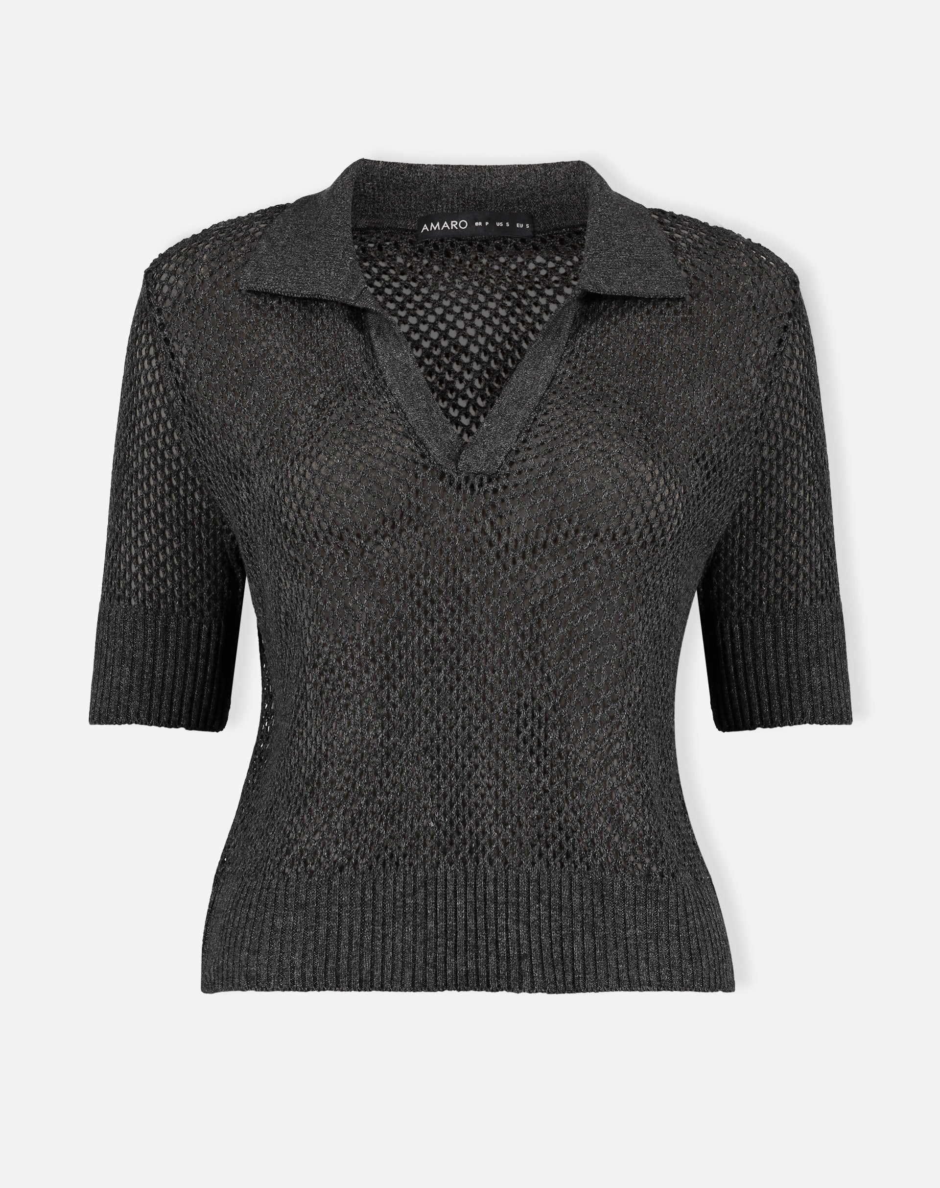 Blusa polo de tricot telado, perfeita para um look casual e descolado. Confeccionada em material reciclado, com gola polo e mangas curtas, é uma peça versátil que te acompanha por várias temporadas.