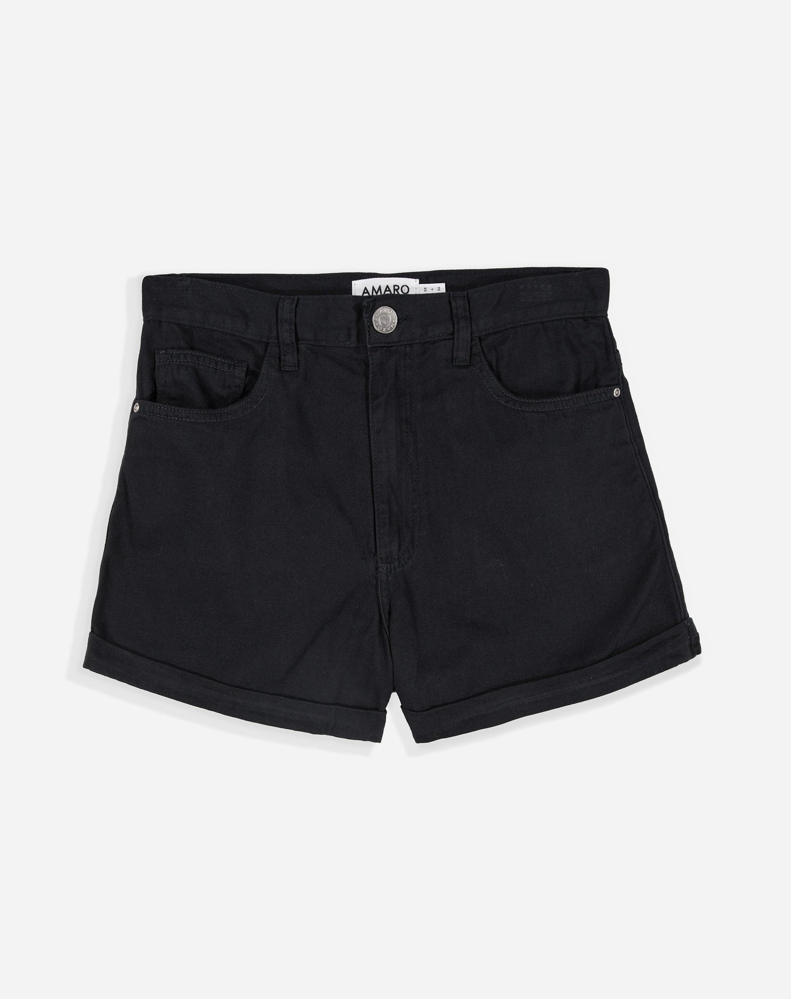 Close-up do shorts de sarja preto com camisa rosa, destacando o cós alto.