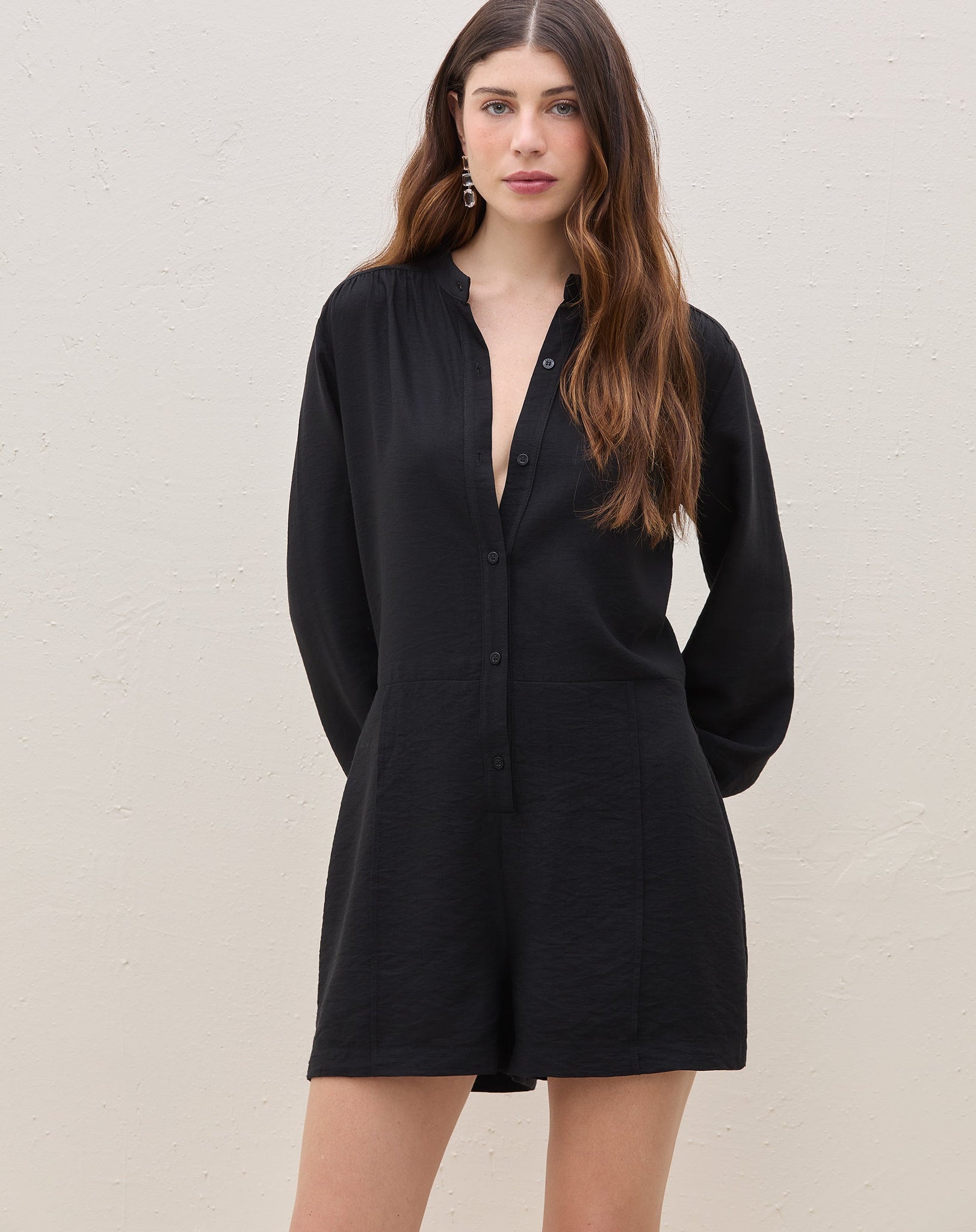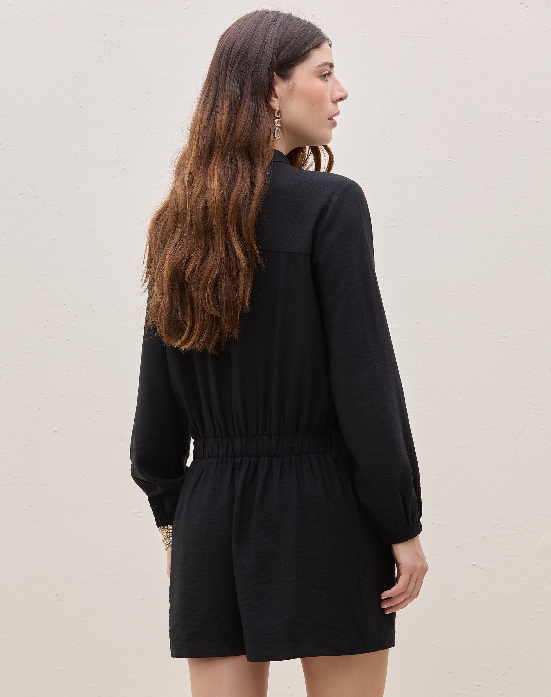 Macaquinho manga longa perfeito para um look elegante e despojado. Destaque para a cintura com amarração e mangas longas. Ideal para eventos casuais ou encontros sofisticados.