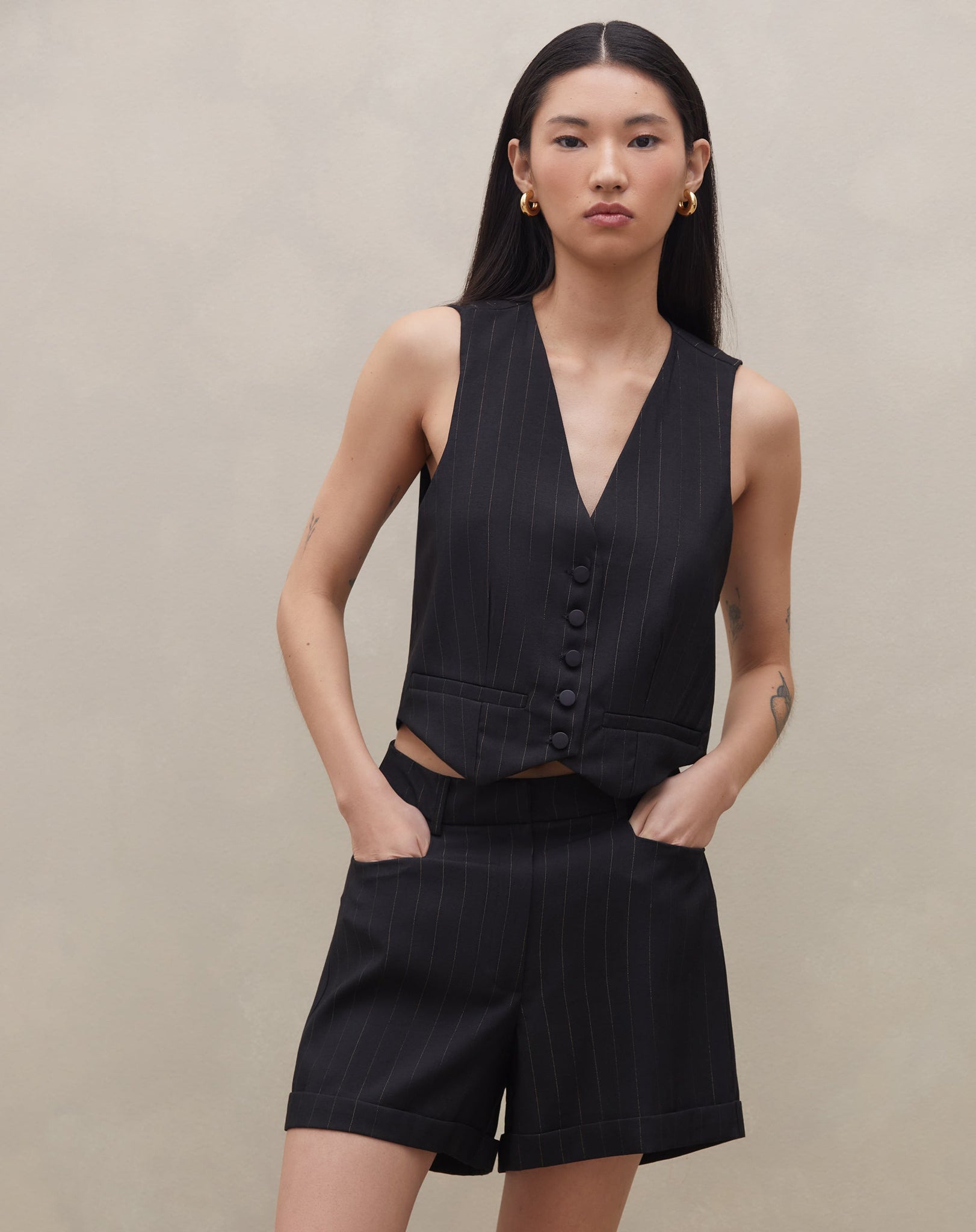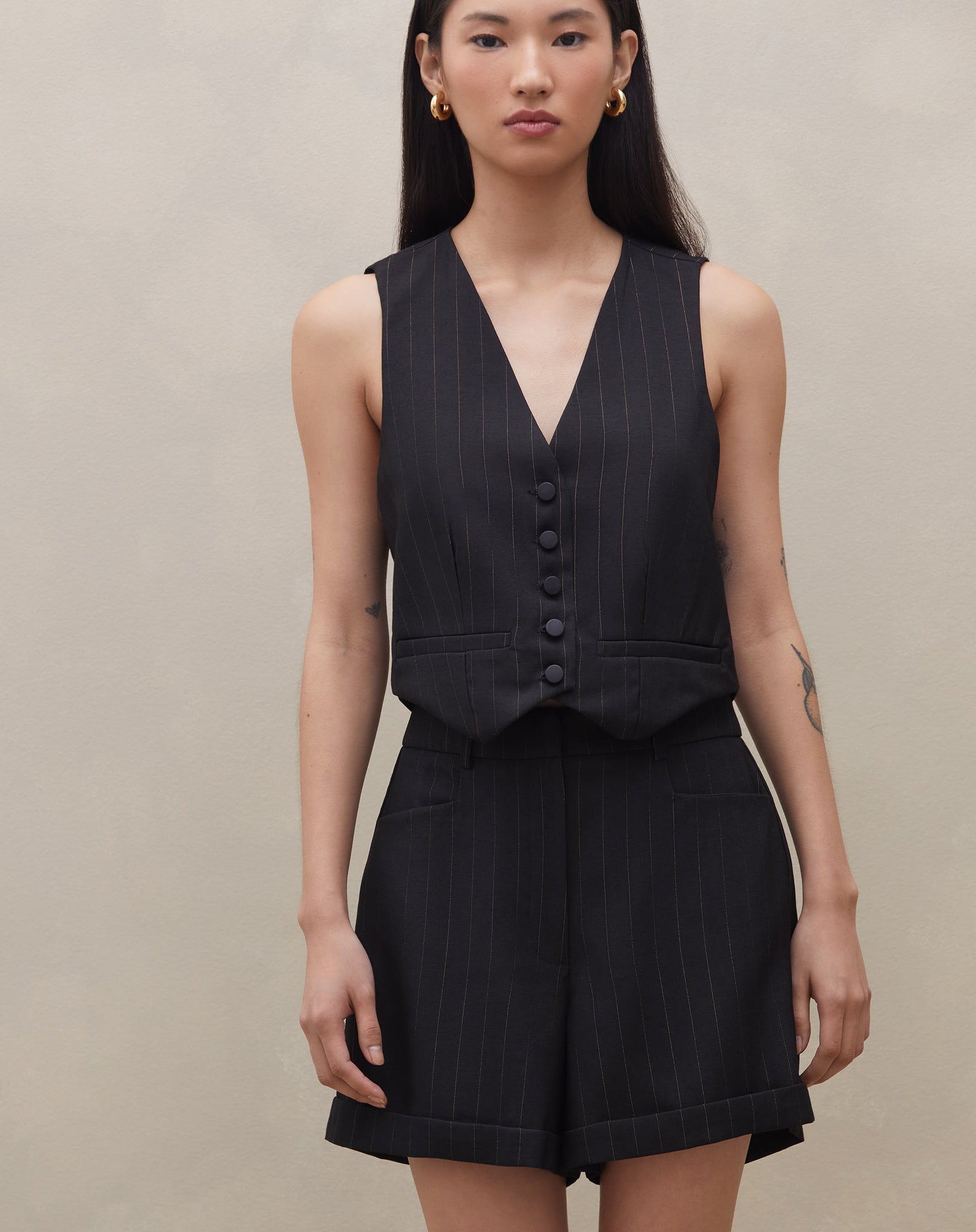 Shorts elegante e versátil, perfeito para um look de trabalho sofisticado. O design evasê e a cintura alta proporcionam um visual moderno e atemporal.