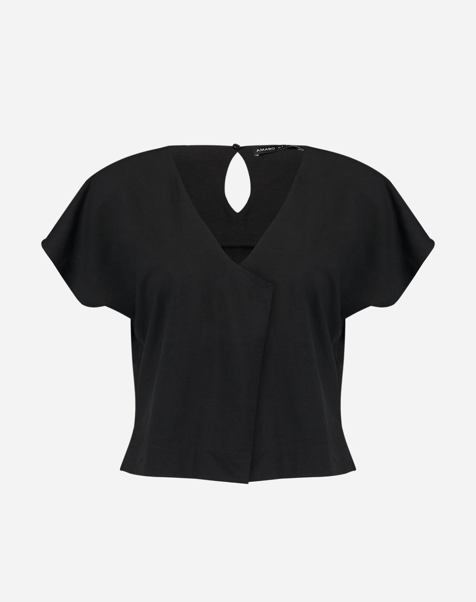 Blusa preta com decote V e mangas curtas, vista frontal.