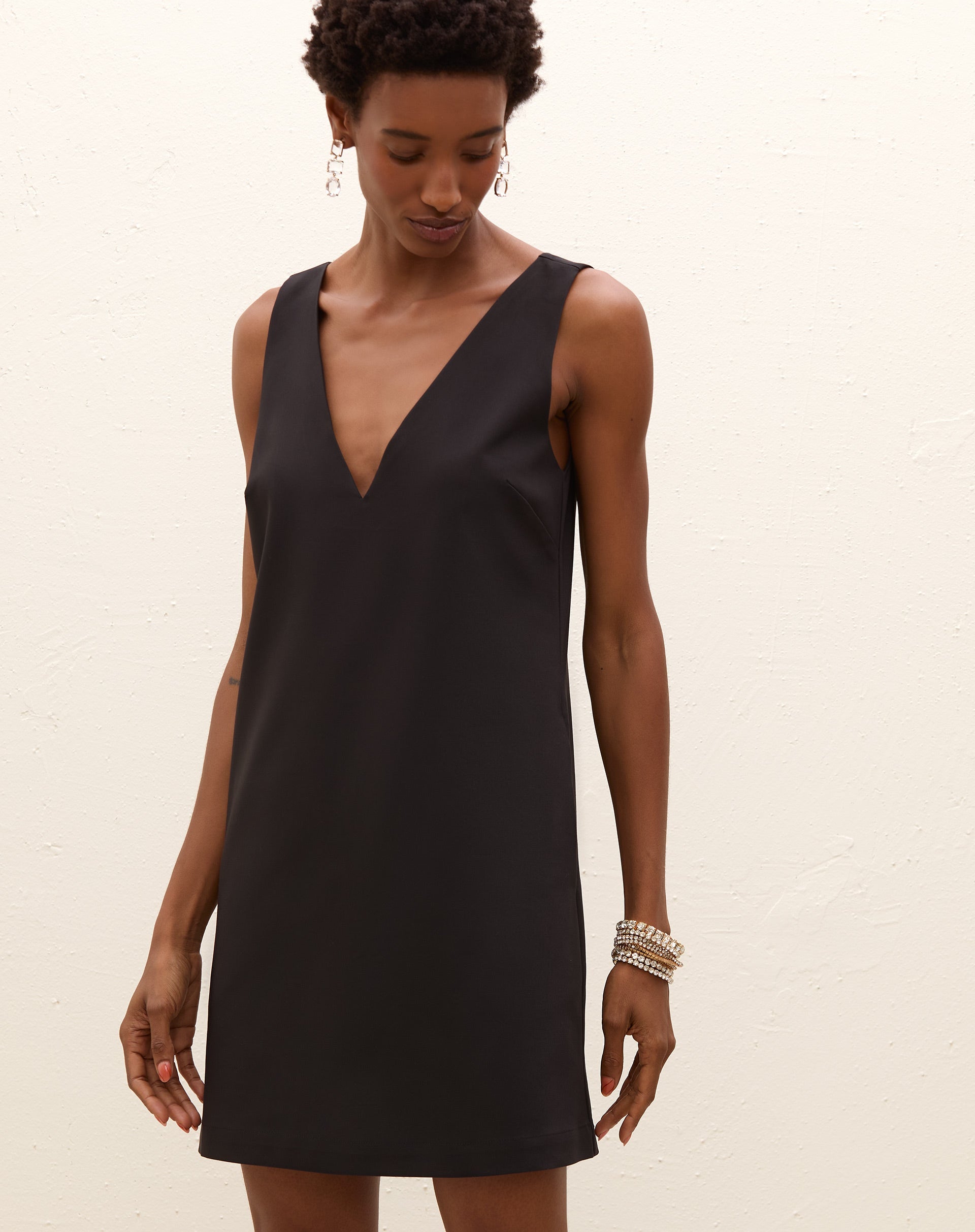 Modelo vestindo um vestido curto preto com decote V na frente, vista frontal.