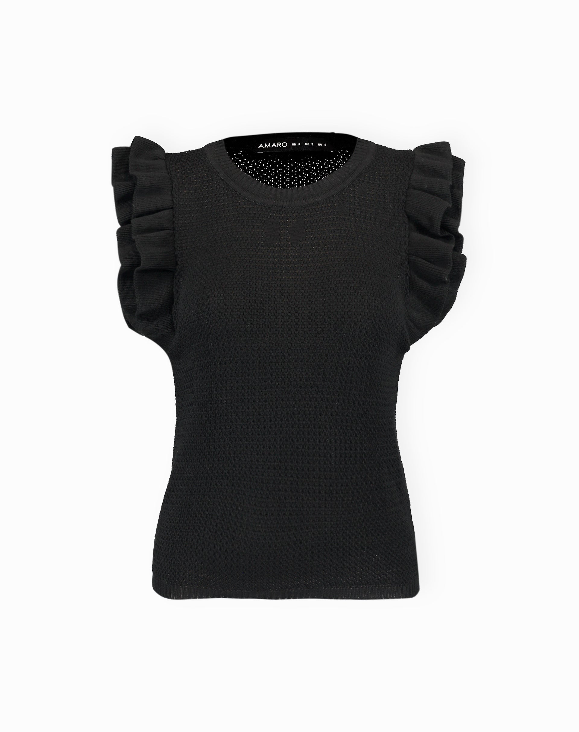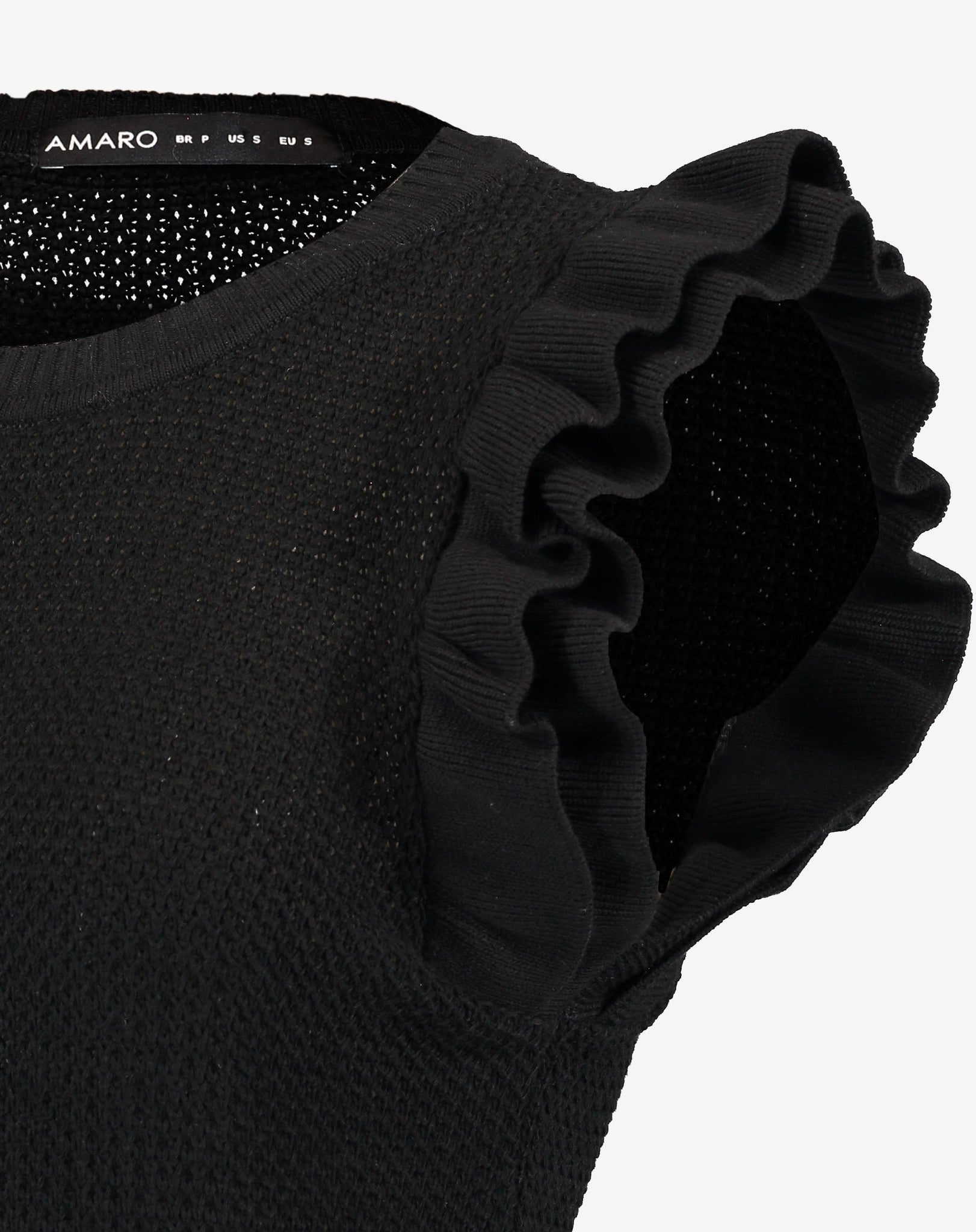 Blusa de tricot preta com manga de babados, imagem plana mostrando o design completo.