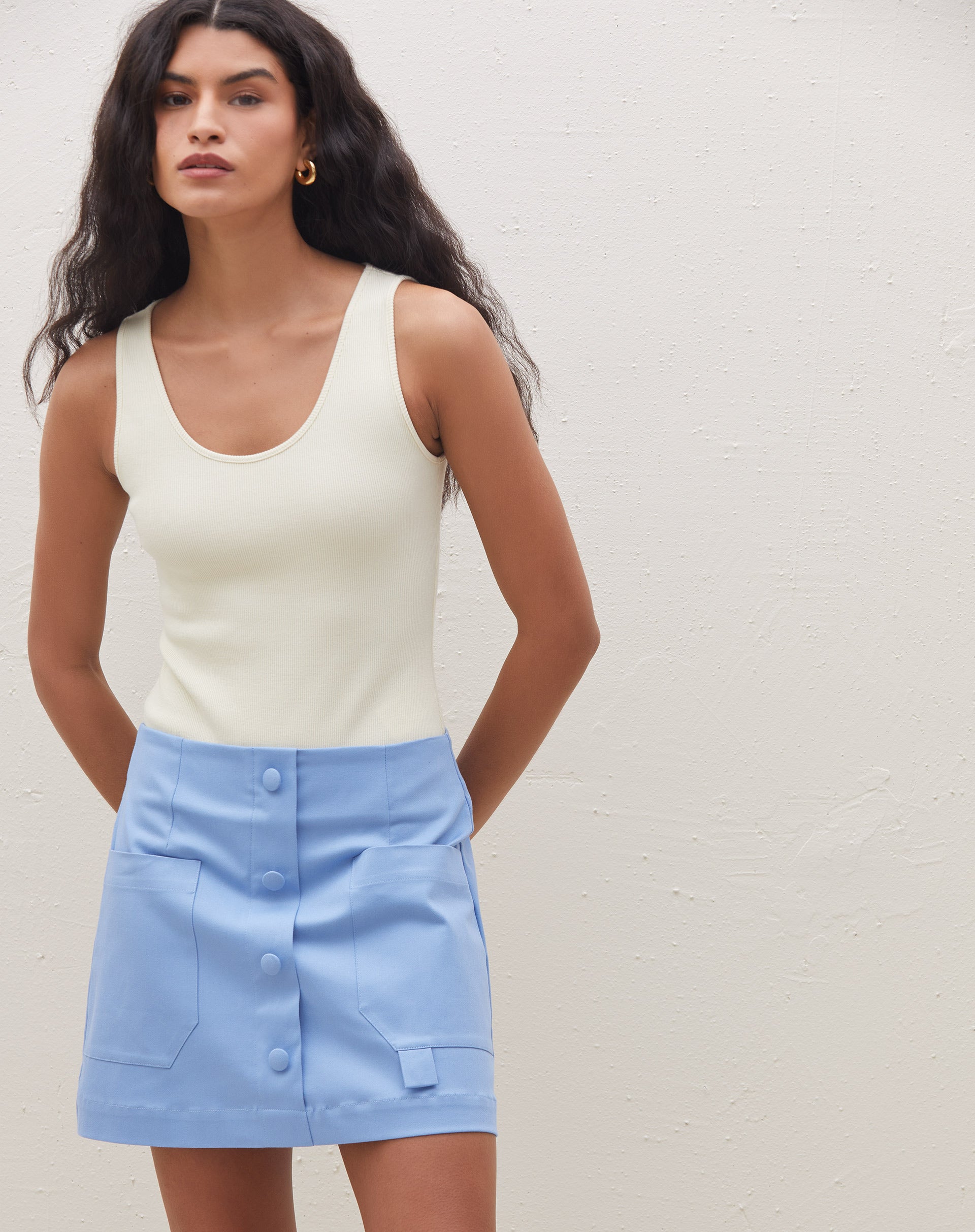 Body de malha com decote em U e alças largas, exibido em um look casual com saia azul.