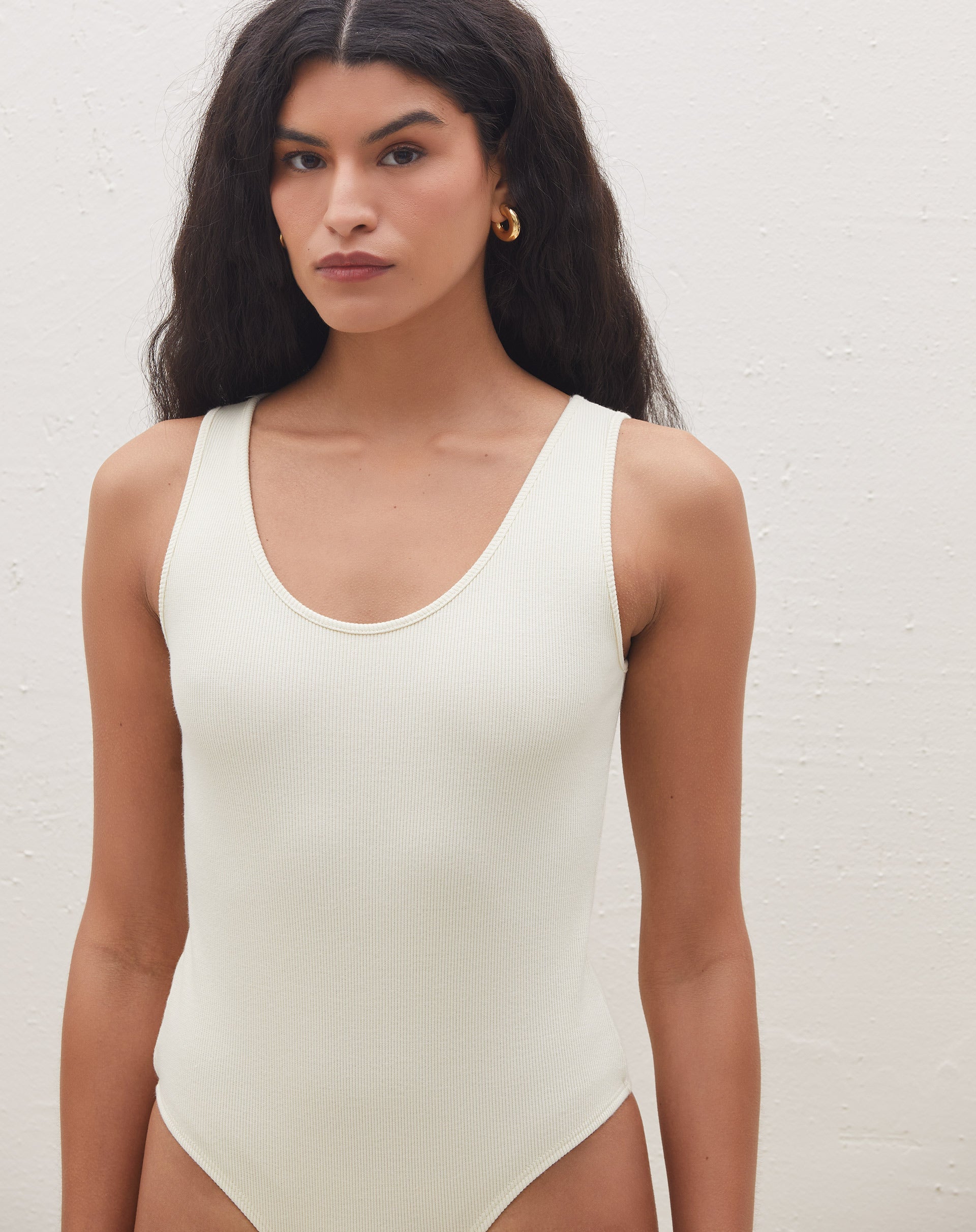 Close-up do decote em U do body de malha na cor manteiga.