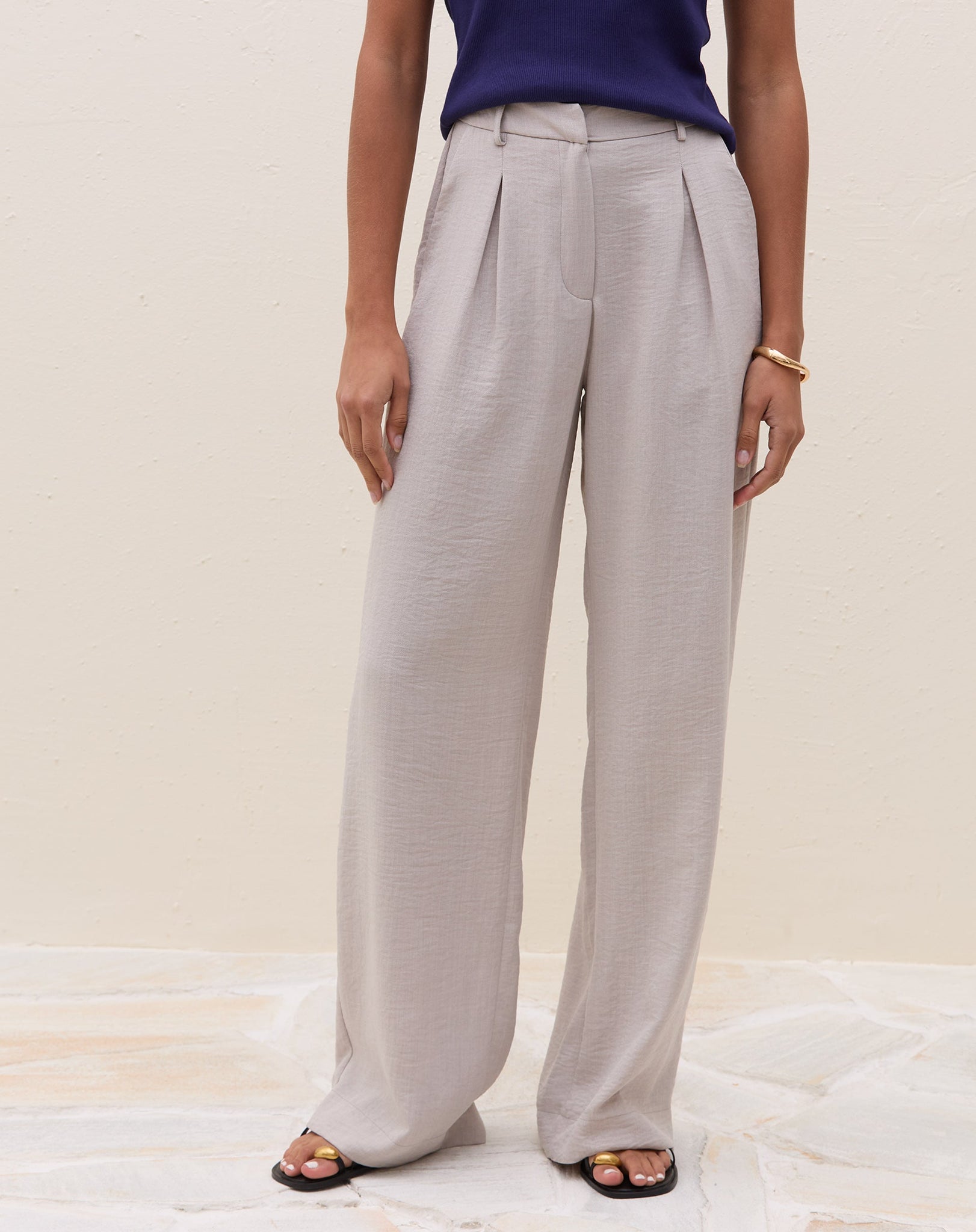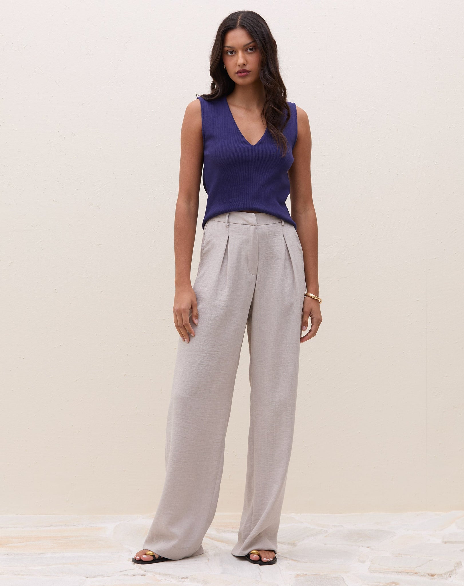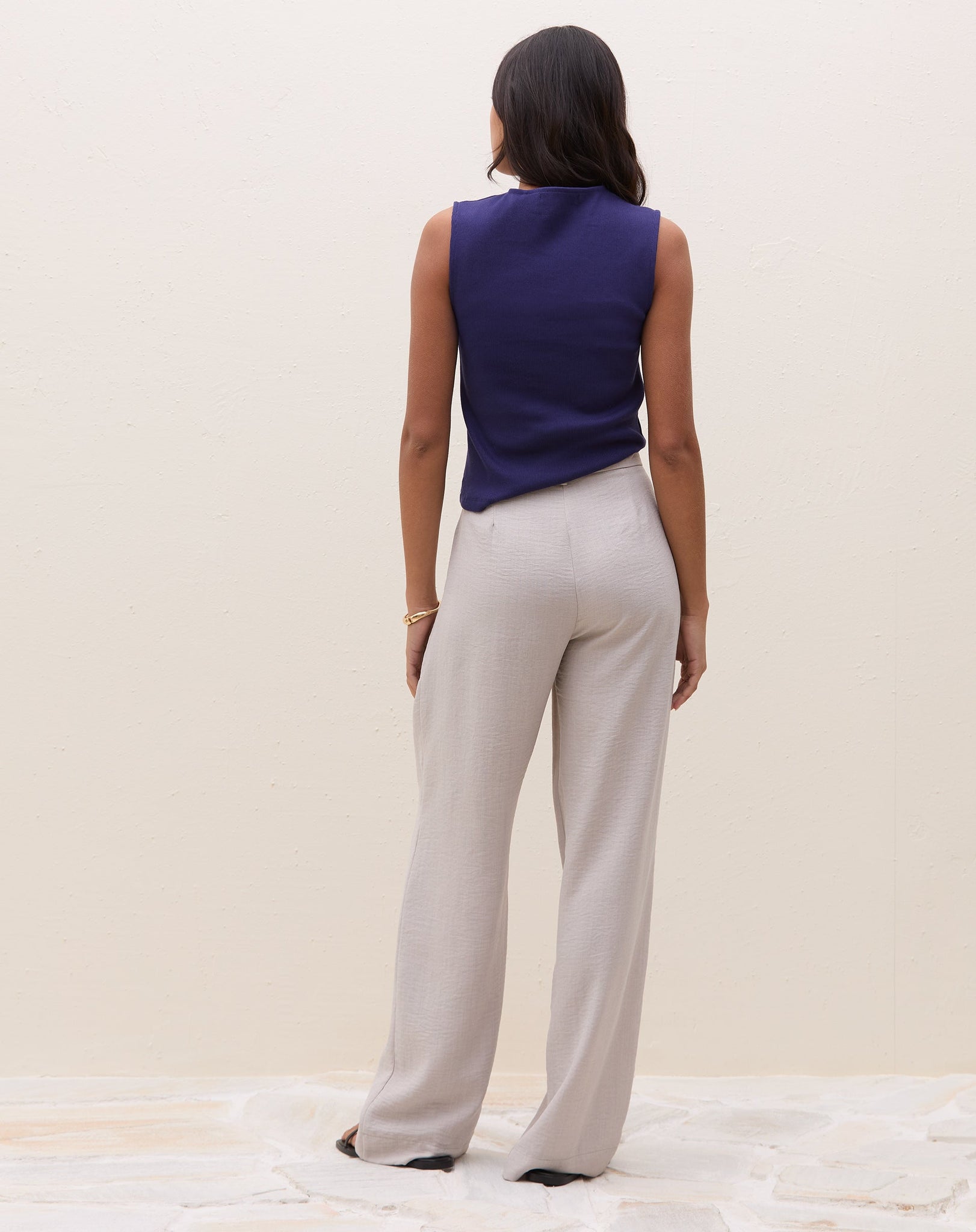 Calça cintura alta com pregas, ideal para um look elegante no ambiente de trabalho. O design clássico e a cintura alta proporcionam um visual sofisticado e atemporal.