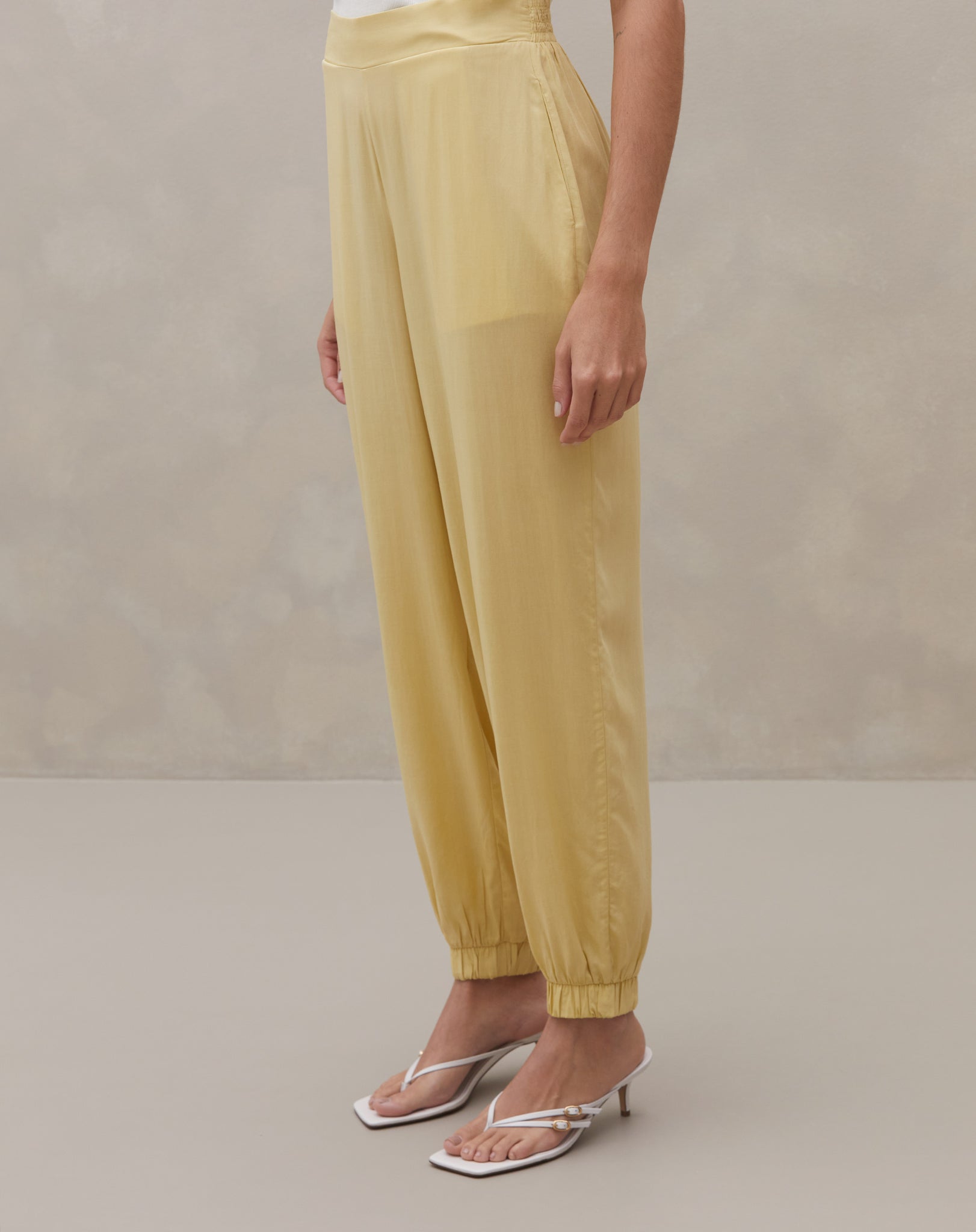 A Calça Jogger Aladim é um item essencial para o closet de quem busca um look fresh e versátil. Confeccionada em viscose e lyocel, possui uma modelagem fluida, com cintura alta e elástico nas barras e tem o estilo contemporâneo que promete ser tendência. Ideal para looks de alto verão e festividades.