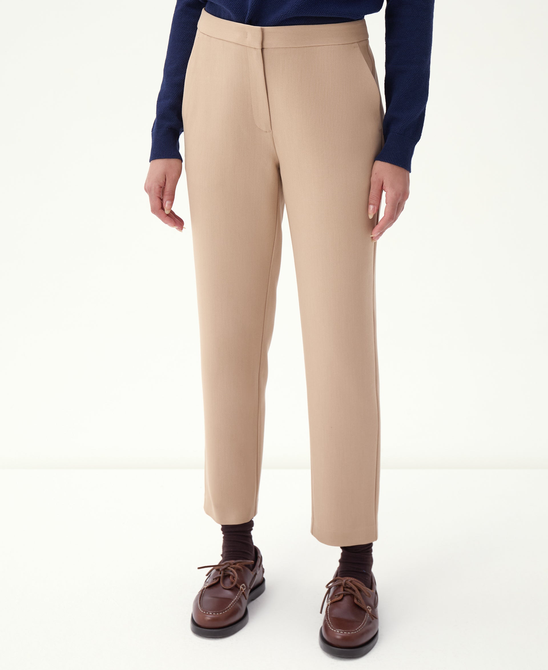 Vista flatlay da calça slim alfaiataria bege sobre fundo branco, destacando comprimento cropped e corte reto.