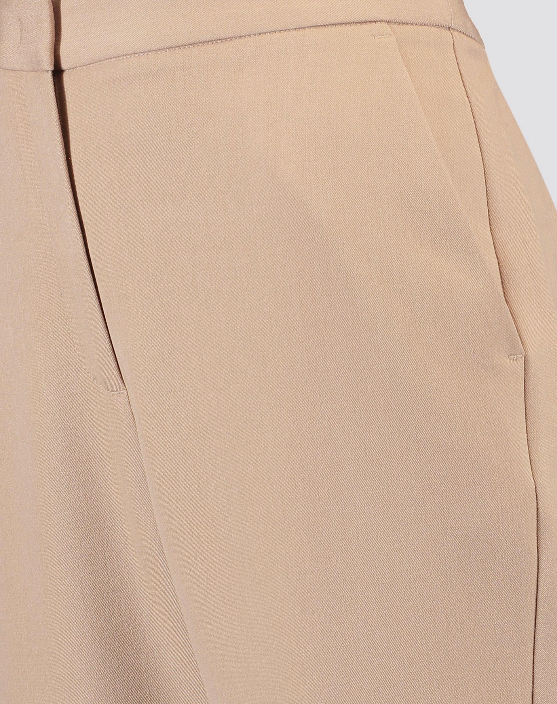 Zoom em detalhe do cós e bolso faca da calça slim alfaiataria bege, evidenciando a qualidade do acabamento.