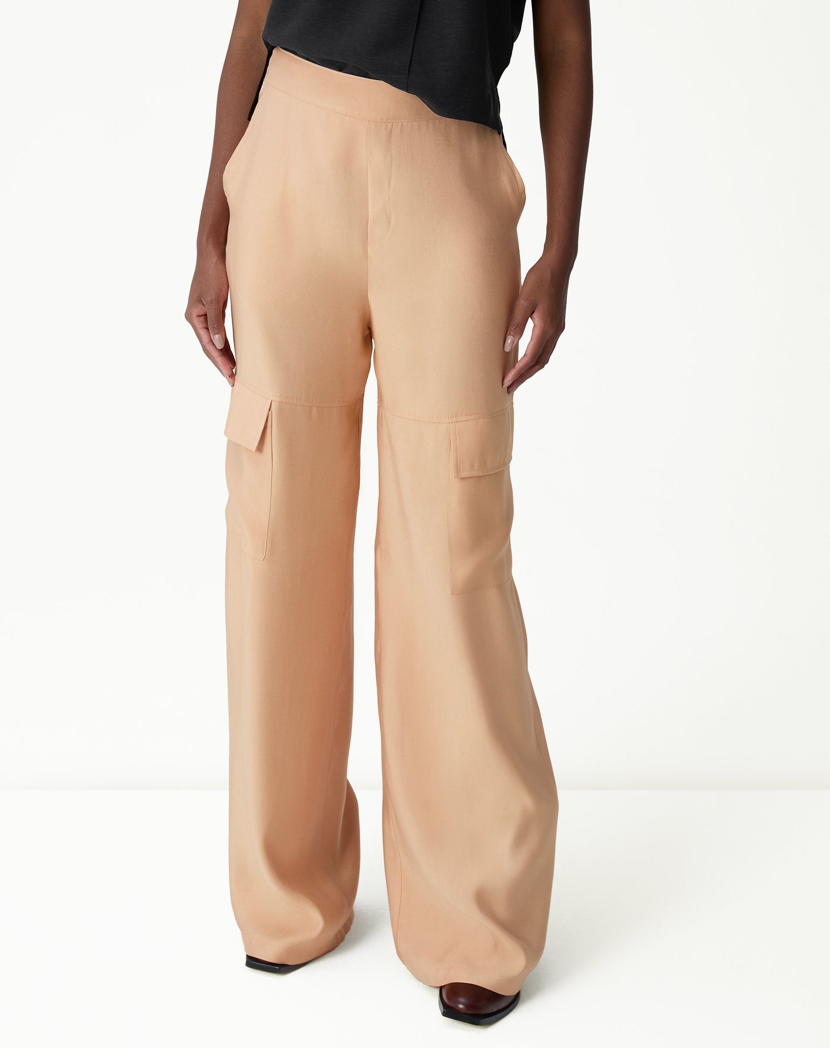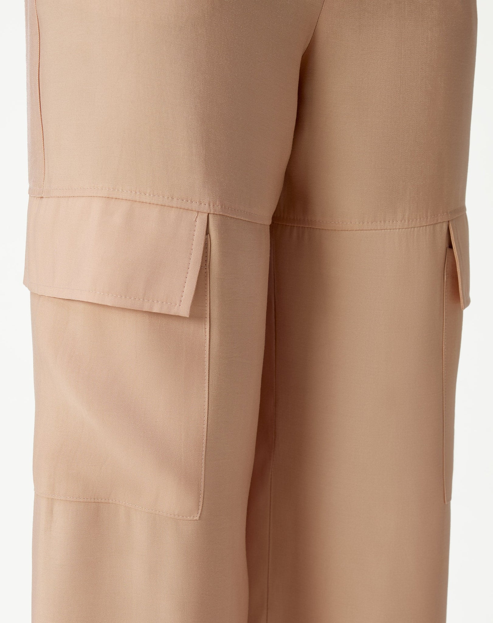 Close-up da calça wide leg cropped alfaiataria bege, destacando os detalhes do tecido e bolsos.