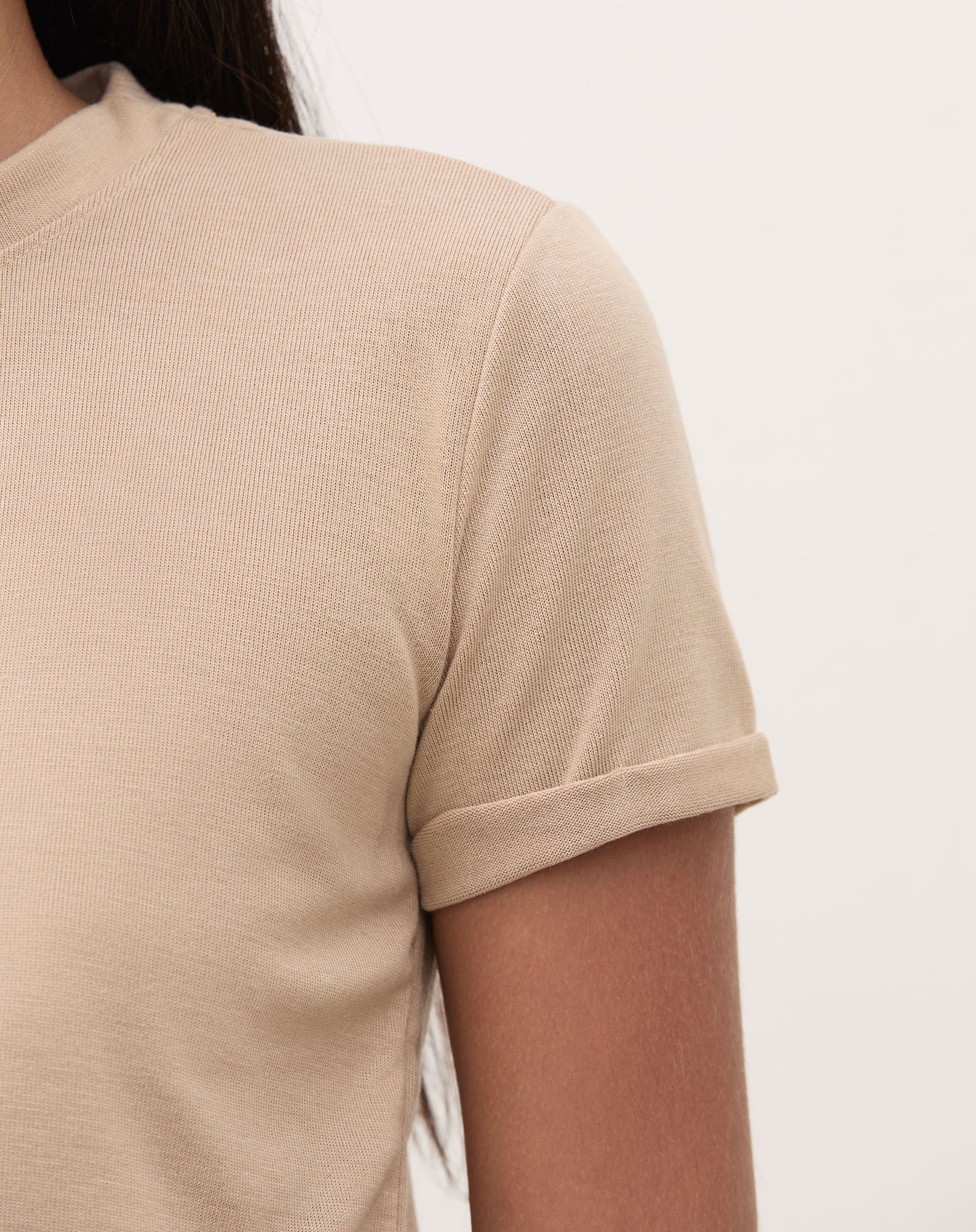 Camiseta de malha bege com mangas curtas dobradas, vista frontal.