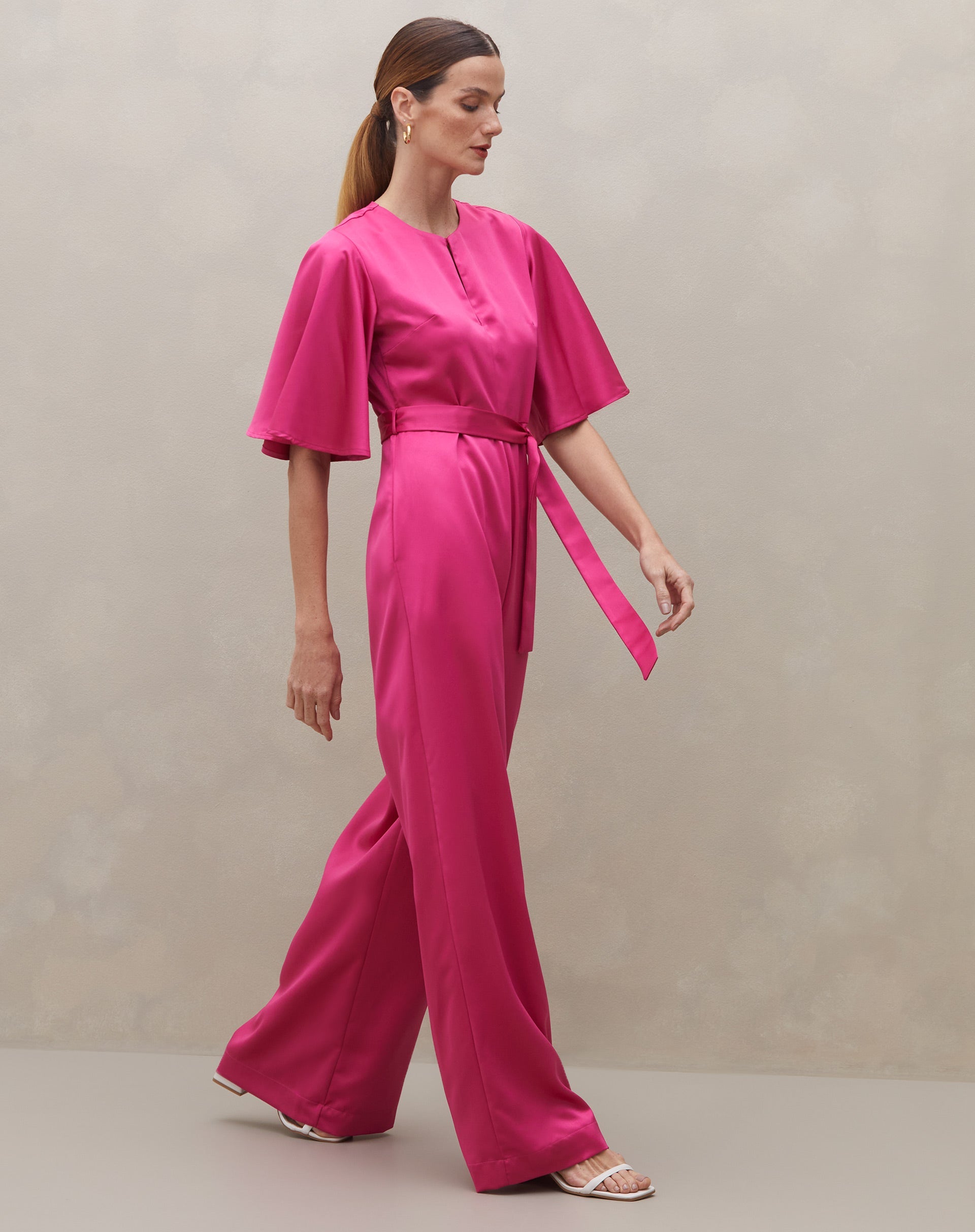 Macacão rosa escuro com mangas sino e cinto, vista lateral.
