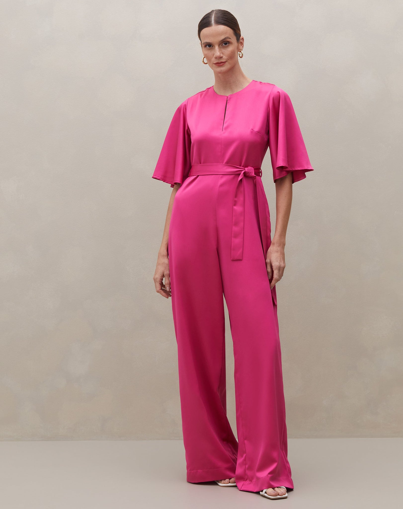 Macacão rosa escuro com mangas sino e cinto, vista frontal.