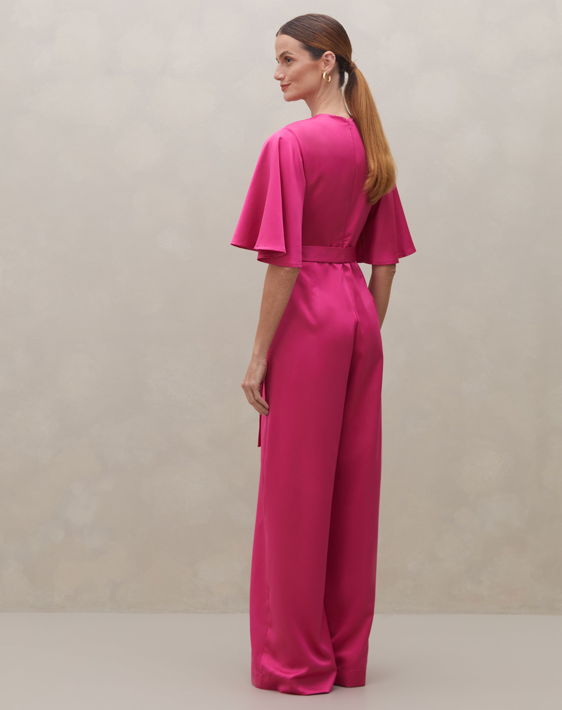 Macacão rosa escuro com mangas sino e cinto, vista traseira.
