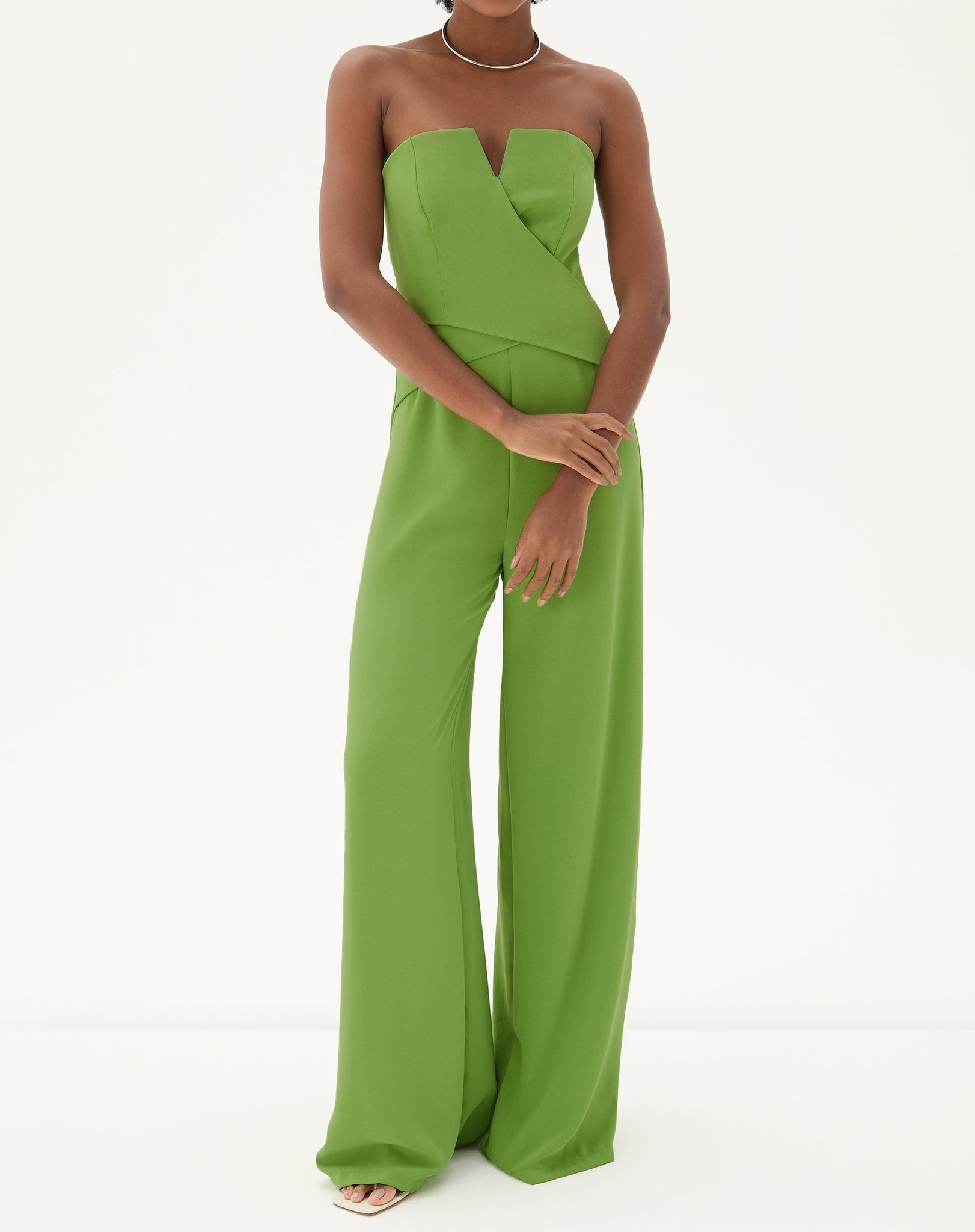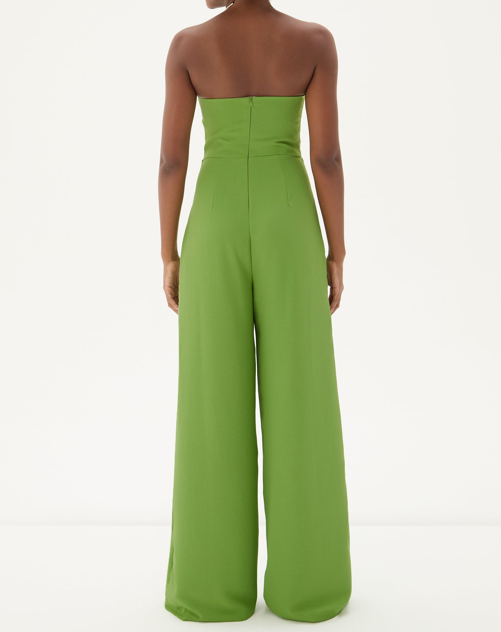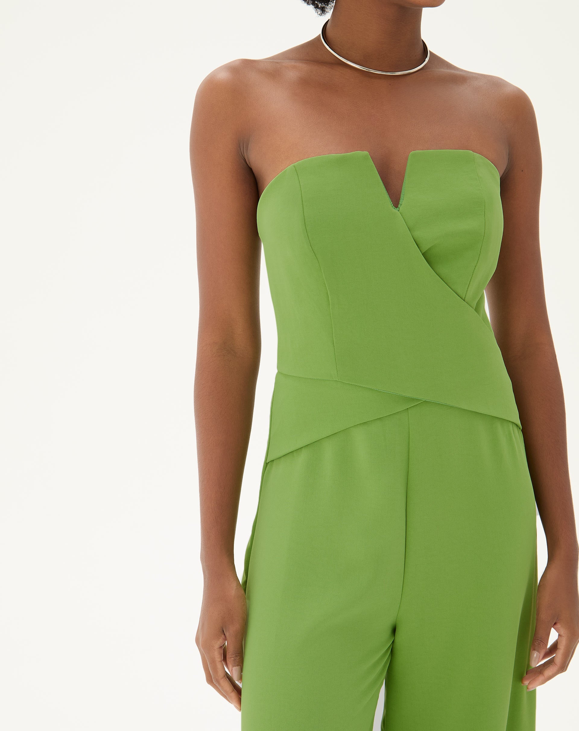 Imagem de um macacão sem alças de alfaiataria em verde, visto de frente, destacando o design minimalista e elegante.