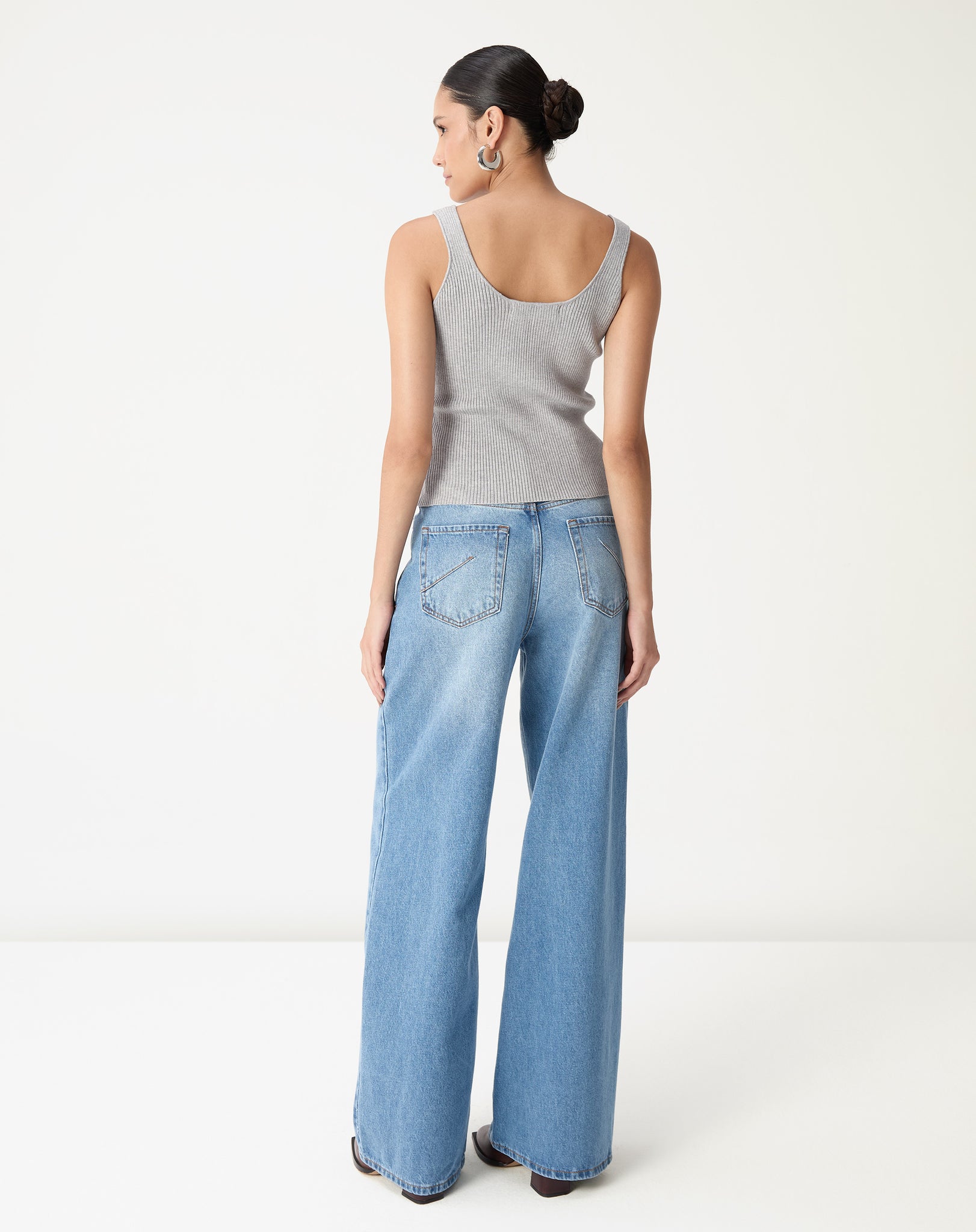 Look completo com regata tricot cinza mescla, calça jeans wide leg lavagem clara e jaqueta preta sobre o ombro