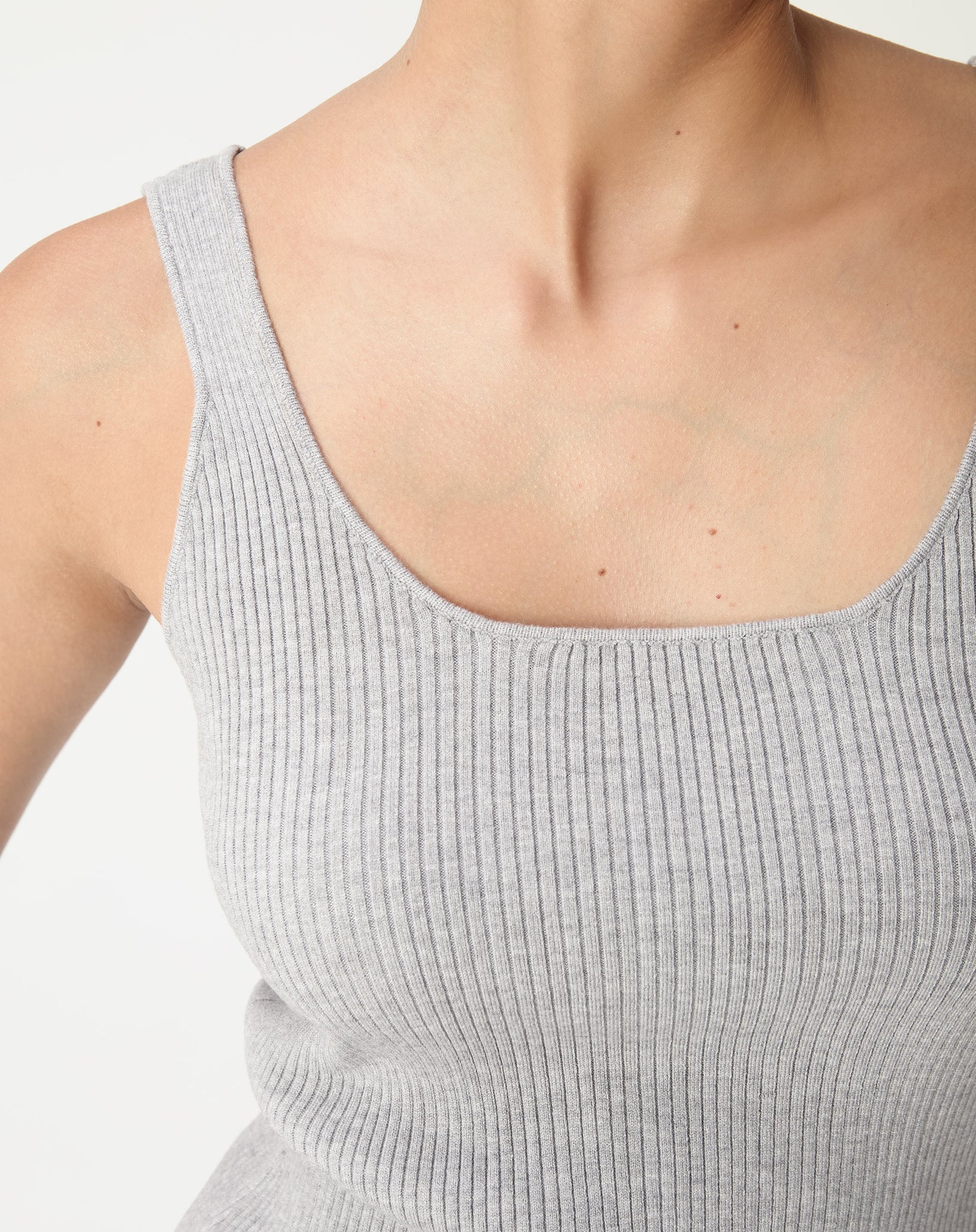 Detalhe em ângulo da regata tricot cinza mescla em flat lay destacando alças largas e canelado
