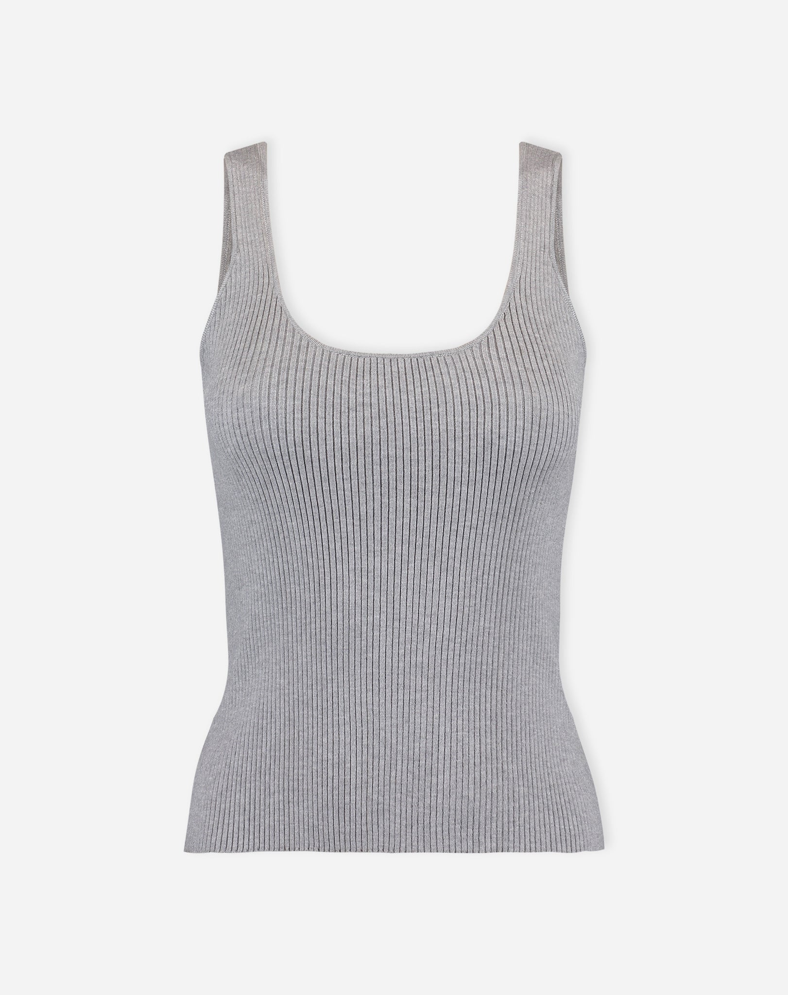 Regata tricot cinza mescla vista plana frontal com textura canelada e barra reta em fundo branco