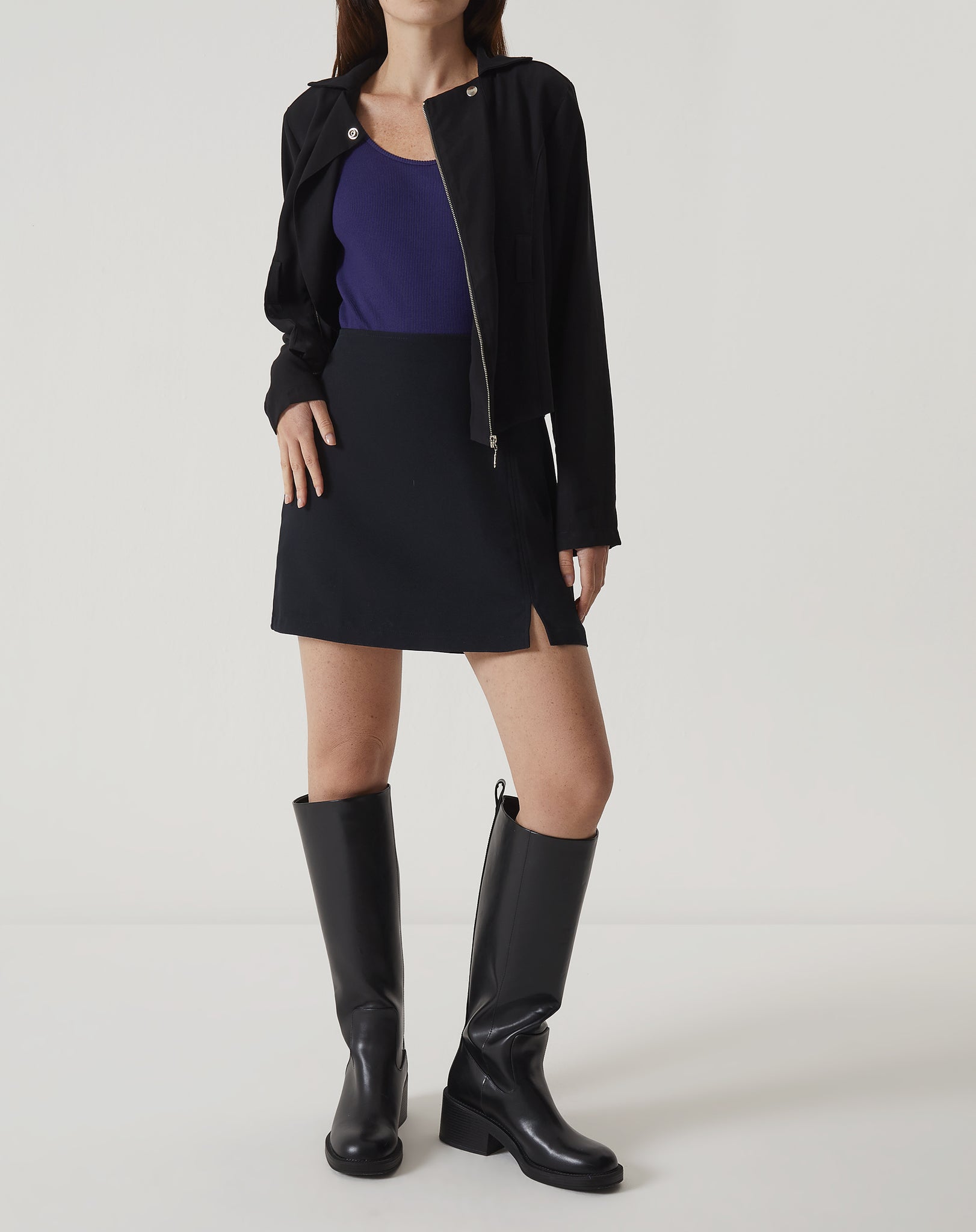 Modelo vestindo saia curta de alfaiataria preta com botas e blusa roxa.