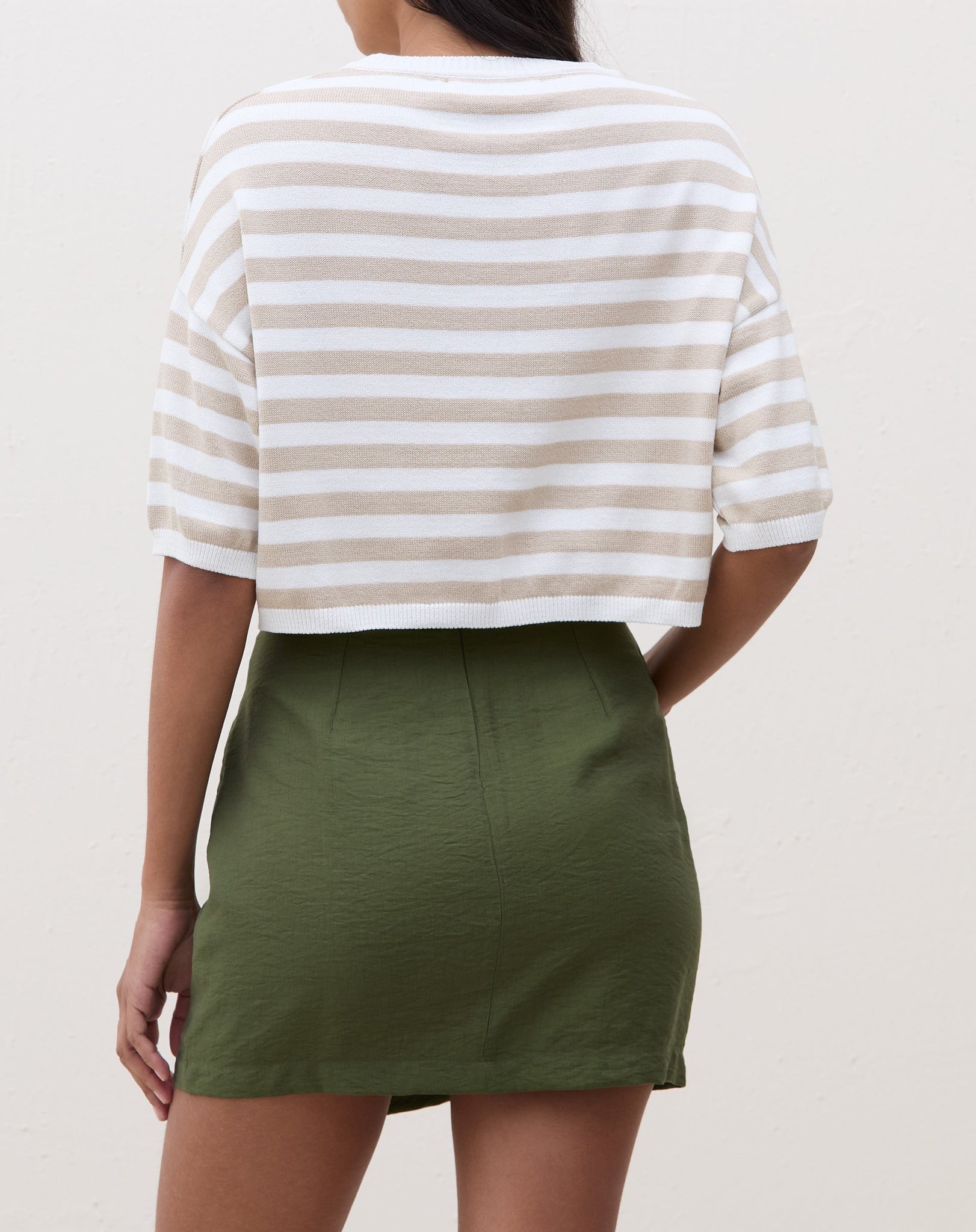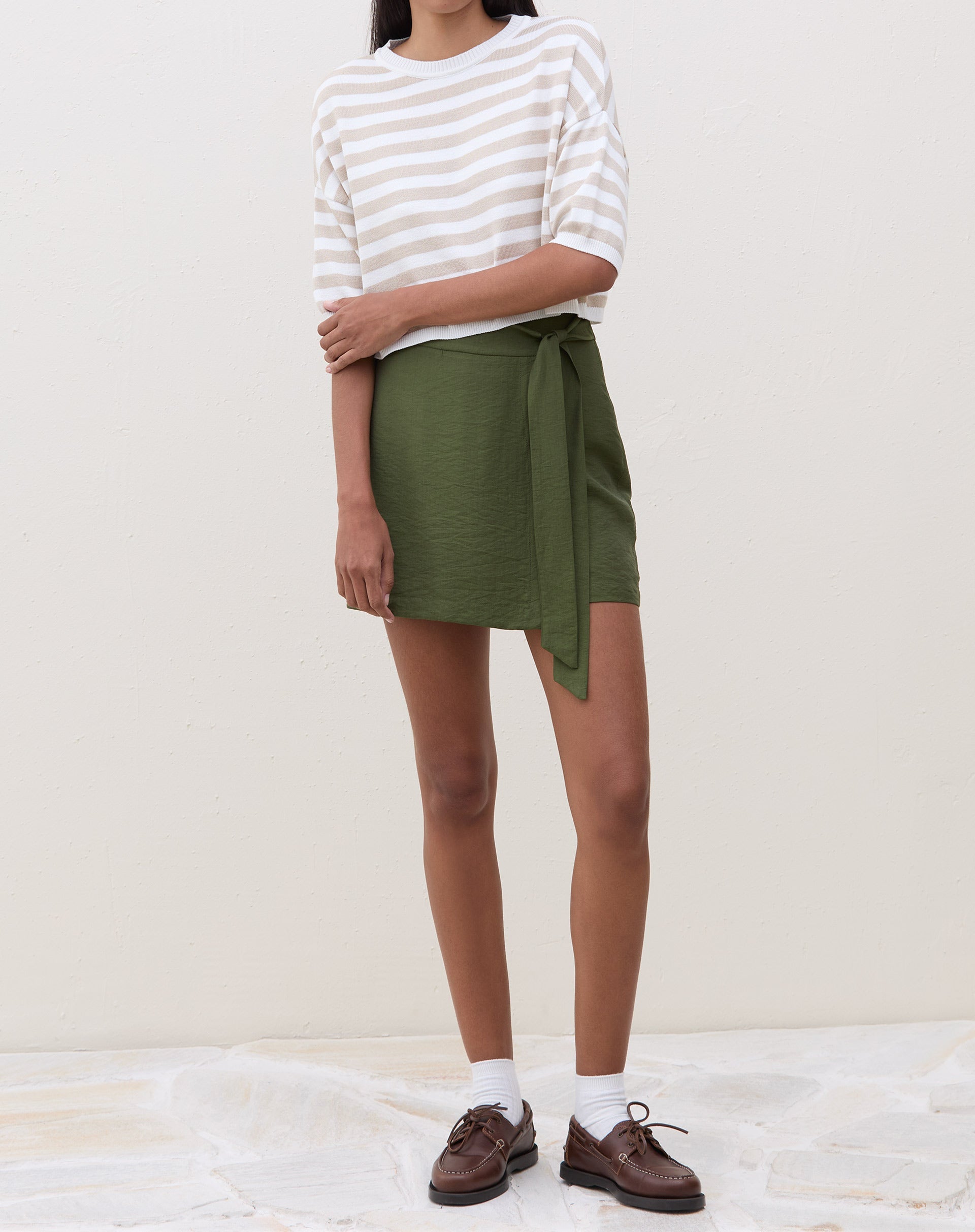 Modelo vestindo saia curta transpassada verde militar com blusa listrada.
