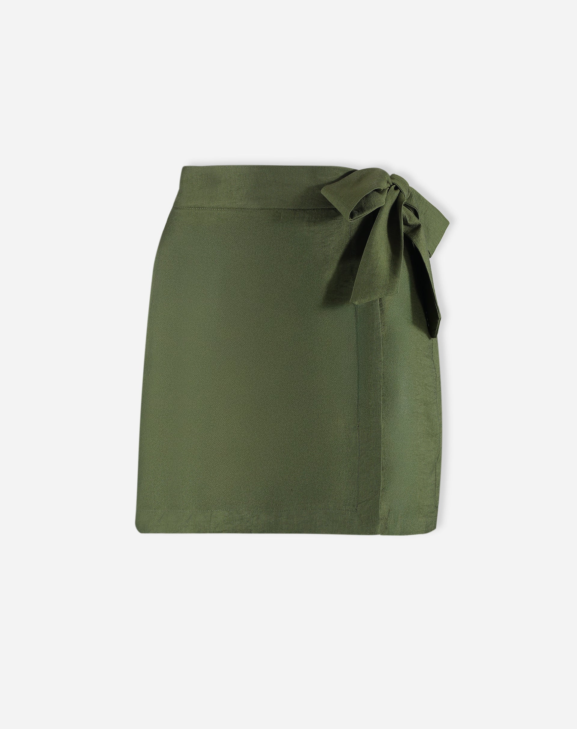 Vista frontal da saia curta transpassada verde militar com amarração.