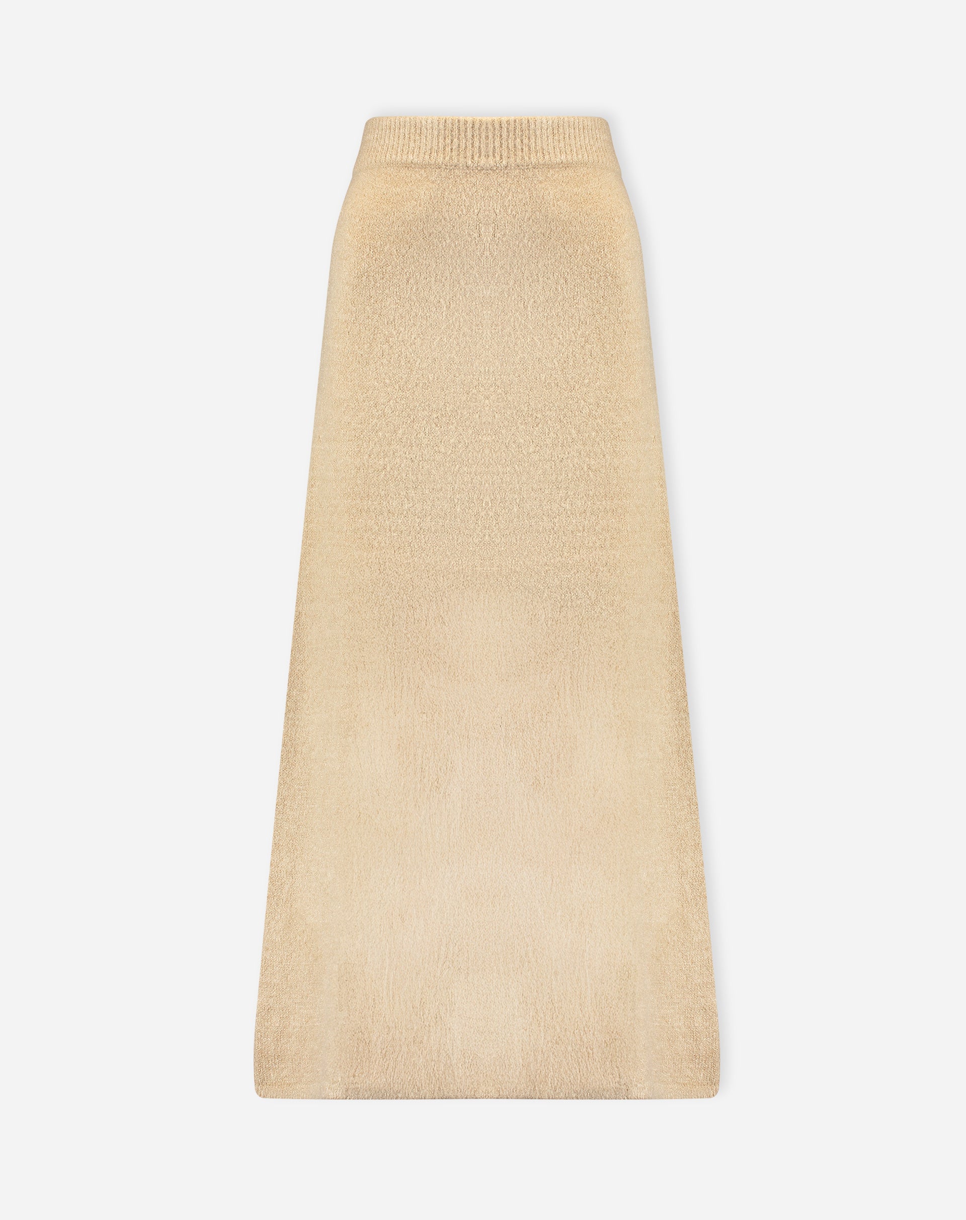 Saia longa tricot bege vista traseira em modelo com cós alto canelado