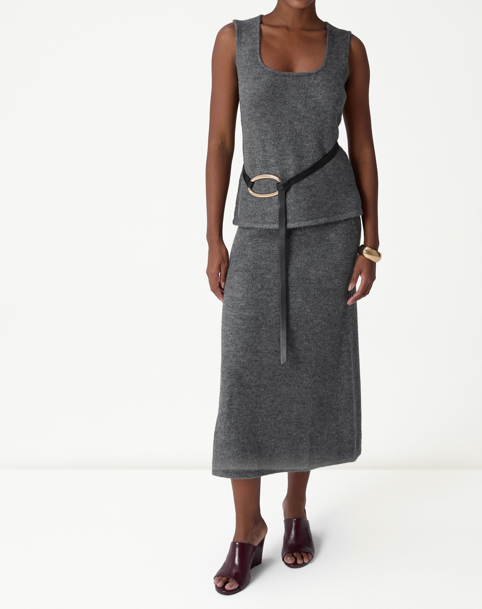 Modelo utilizando saia longa tricot chumbo com top sem mangas: visual completo frontal mostrando cós alto e corte reto.