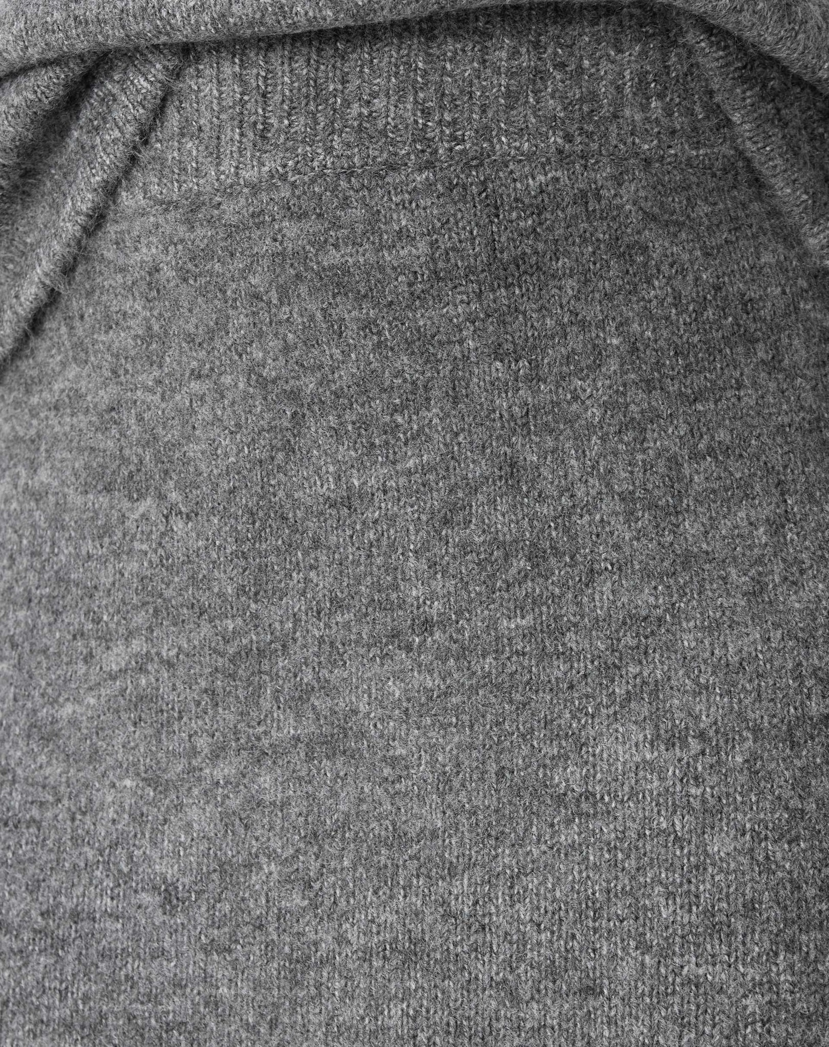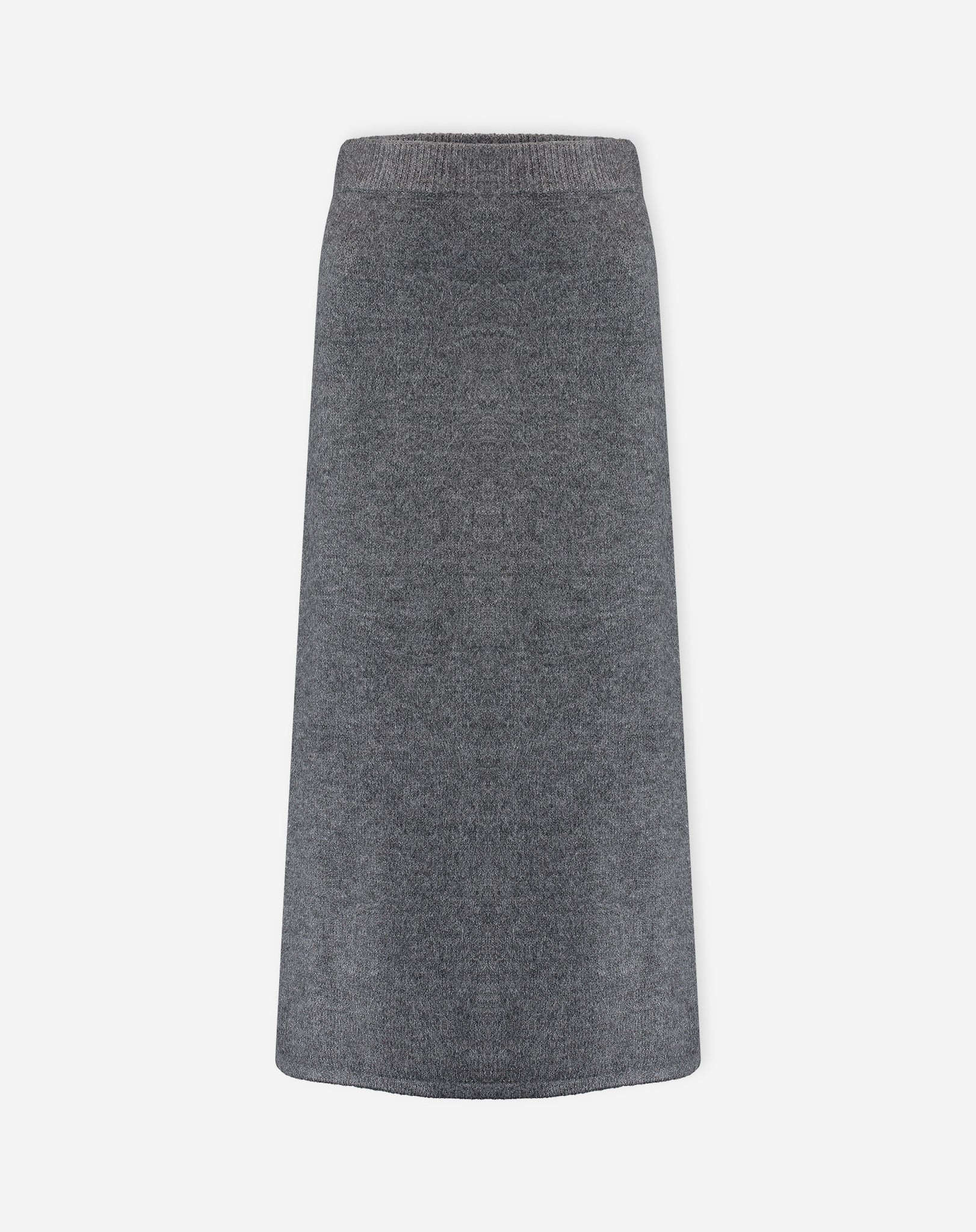 Detalhe frontal da saia longa tricot chumbo destacando o cós alto canelado e o caimento da malha.