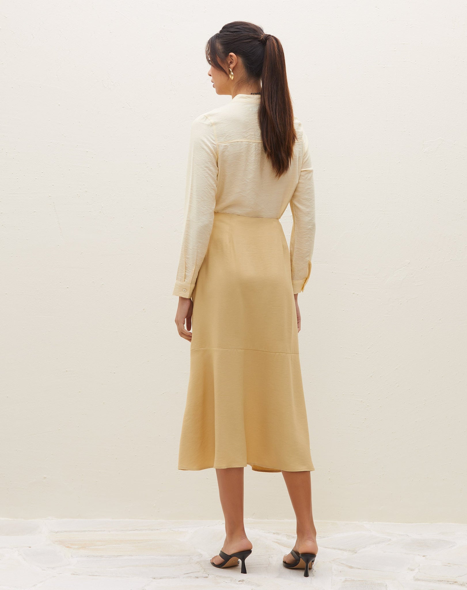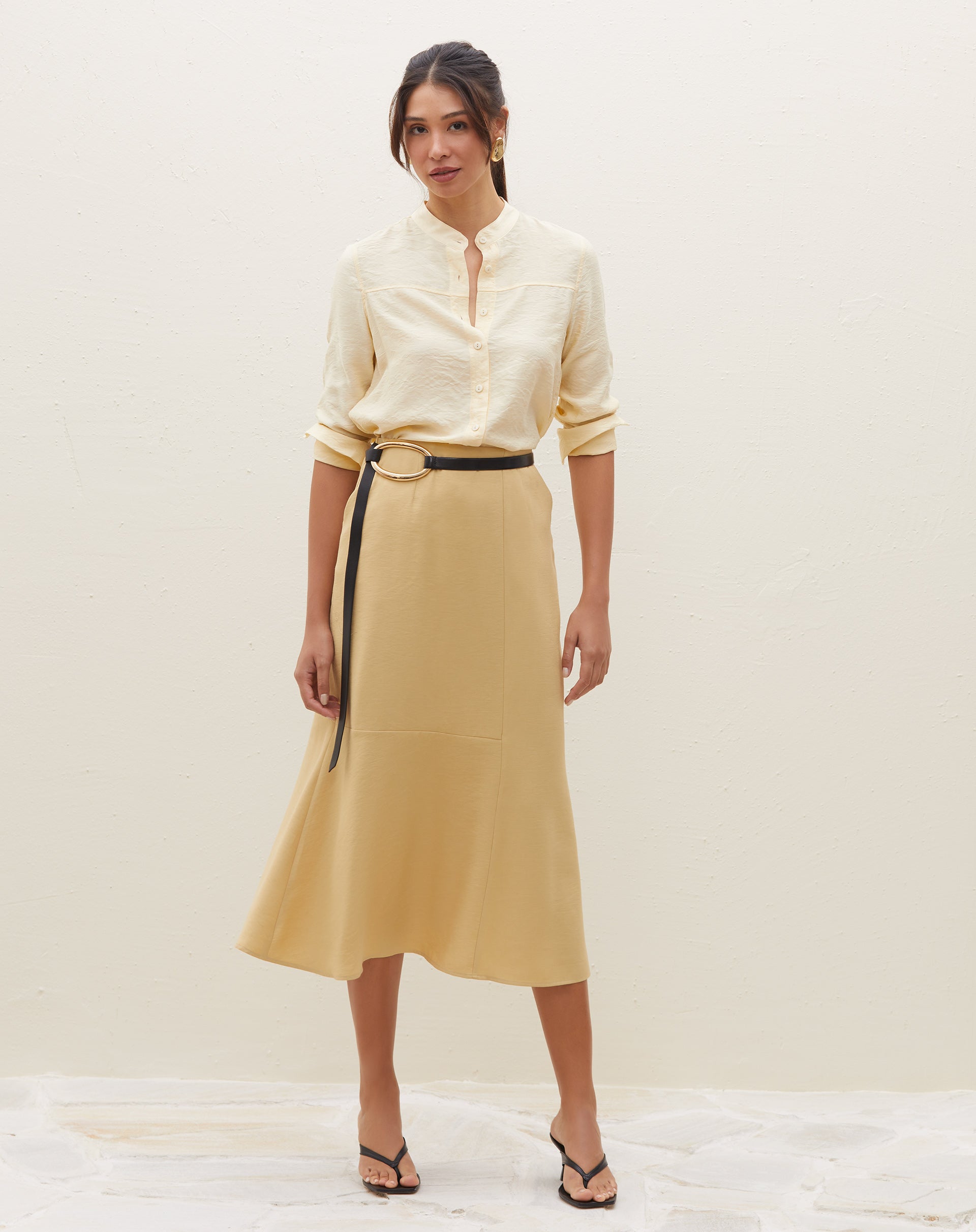 Uma peça versátil e elegante para diversas ocasiões. A saia midi com recortes é um item clássico e urbano, perfeito para trabalhar ou momentos casuais. Seu design alfaitarado e cintura alta garantem um look elevado e sofisticado.