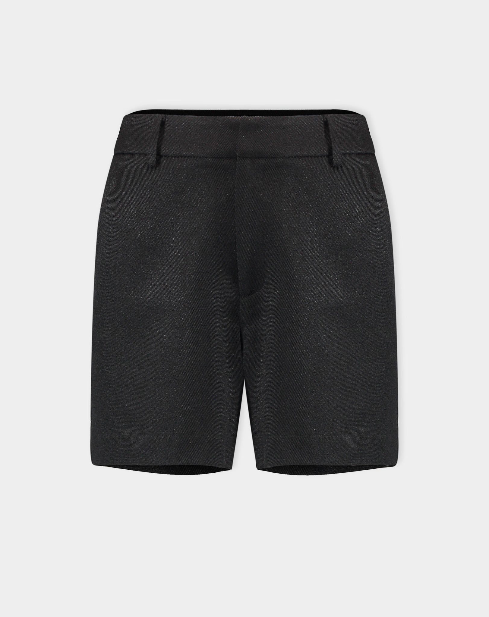 Shorts alfaiataria preto exibido em flat lay, vista frontal, tecido plano em poliéster e corte curto