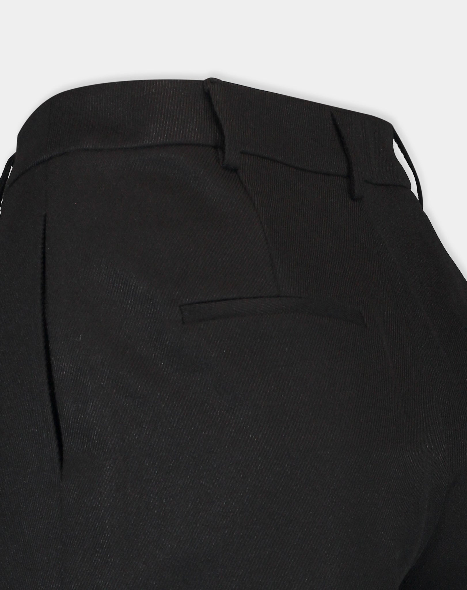 Detalhe lateral e traseiro do shorts preto mostrando bolso embutido e caimento estruturado no quadril